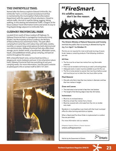 OJIBWAY PROVINCIAL PARK Located 25 km south of Sioux Lookout off Highway 72, Ojibway Provincial Park is managed by Community Living Dryden, the Municipality of Sioux Lookout, the Ministry of Natural Resources and Ontario Parks. The park offers camping from early May until Labour Day with daily, weekly, monthly, or season-long rental options for both electrical and non-electrical sites. Ojibway Provincial Park also offers boat storage, picnic shelter rental, a laundromat, affordable canoe, kayak, and paddleboat rentals, group camping, and special events throughout the season. With a beautiful beach area, various boat launches, a playground, scenic lookouts and over 11 km of pristine nature trails, Ojibway Provincial Park has everything to suit your camping needs. For more information, visit the park’s website at ojibwaypark.info or contact staff at (807) 737-2037.