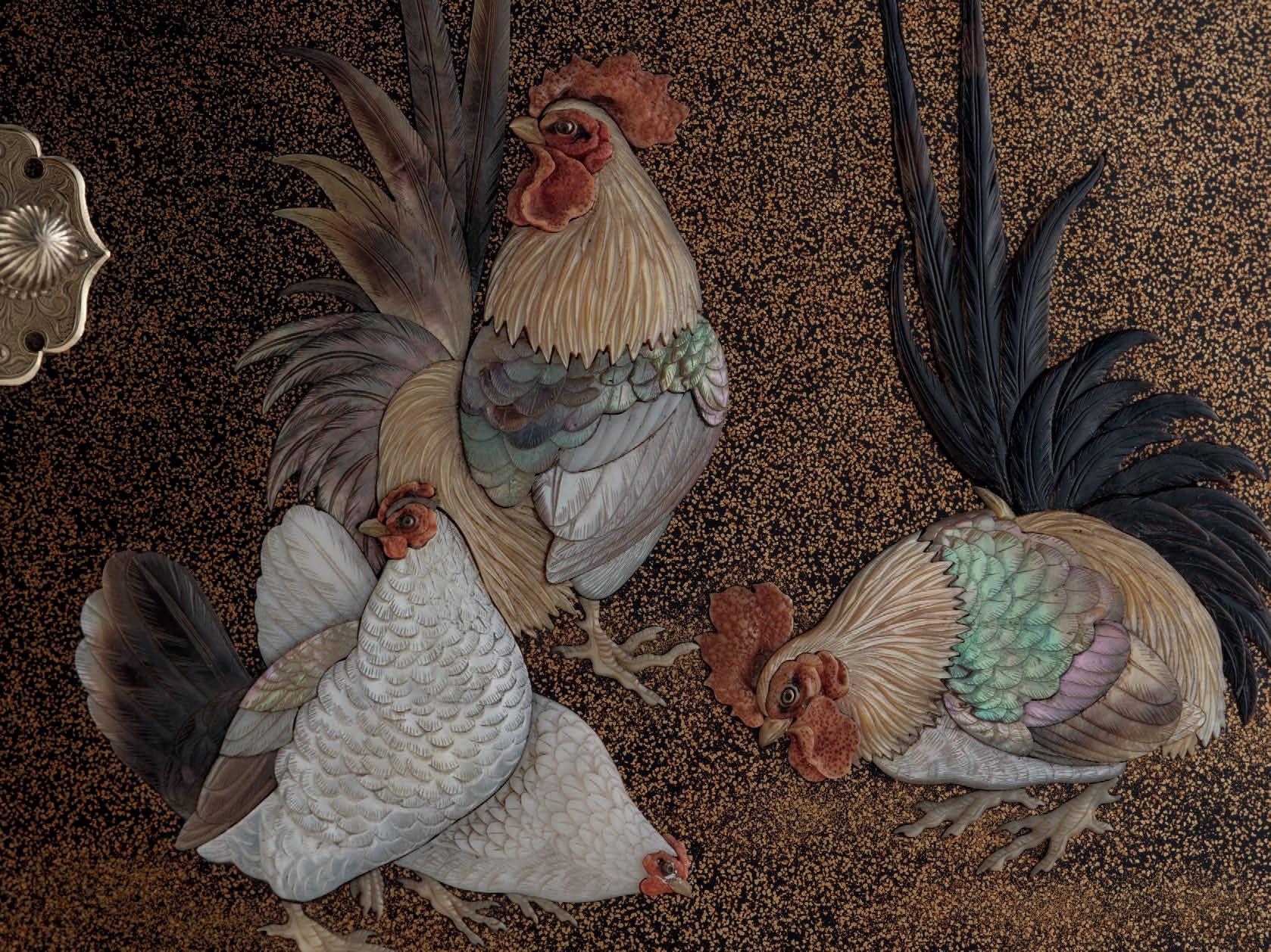 這件刀拵以最為繁複的芝山工藝,採用貝母、玳瑁等珍貴材質精雕細琢,在狹長的刀拵上繪製金菊翠竹、牡 丹朱雀等精緻圖樣,尤其孔雀一身彩衣,絲絲縷縷皆盡細細刻畫,令人驚歎,珍木繁複花鳥瑩亮,奢華富麗, 氣度非凡。