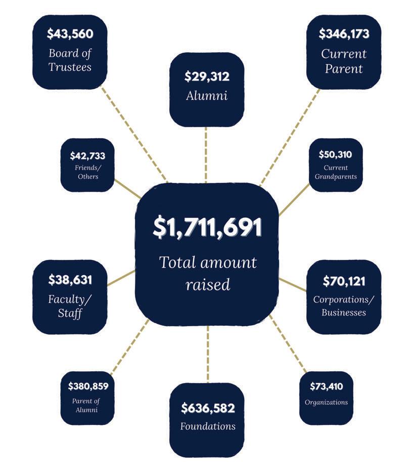 The names listed under each giving level represent the many ways members of our WMA community lend their support, including gifts to The Waldron Fund, Scholarship Fund, Special Designated Fund, Capital Improvements, EITC/OSTC, Tigerfest, Golf Outing, and fulfilling pledges to the Table of Mercy Cafeteria Transformation Project.
