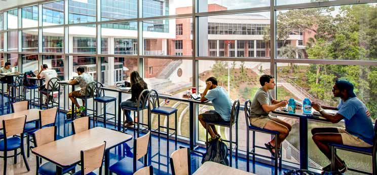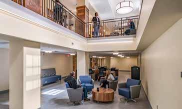 Comfortable seating areas throughout the open communal space attract people and provide opportunities to interact, connect, study, or work.