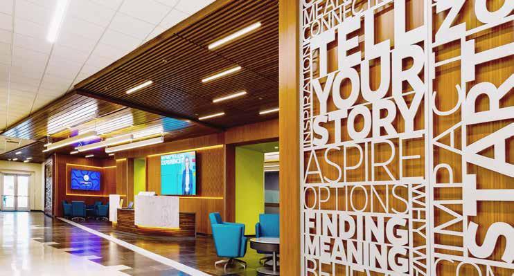 Dropped ceilings are eliminated in all group spaces to maximize the volume of these busy spaces. The exposed ceiling, building systems, and coordinated light fixtures provide texture and energy to match the pulse of large group spaces and corridors. We took advantage of every opportunity to bring texture and color into areas that serve as information points or collaborative spaces, highlighting the places that bring people together to share and learn.