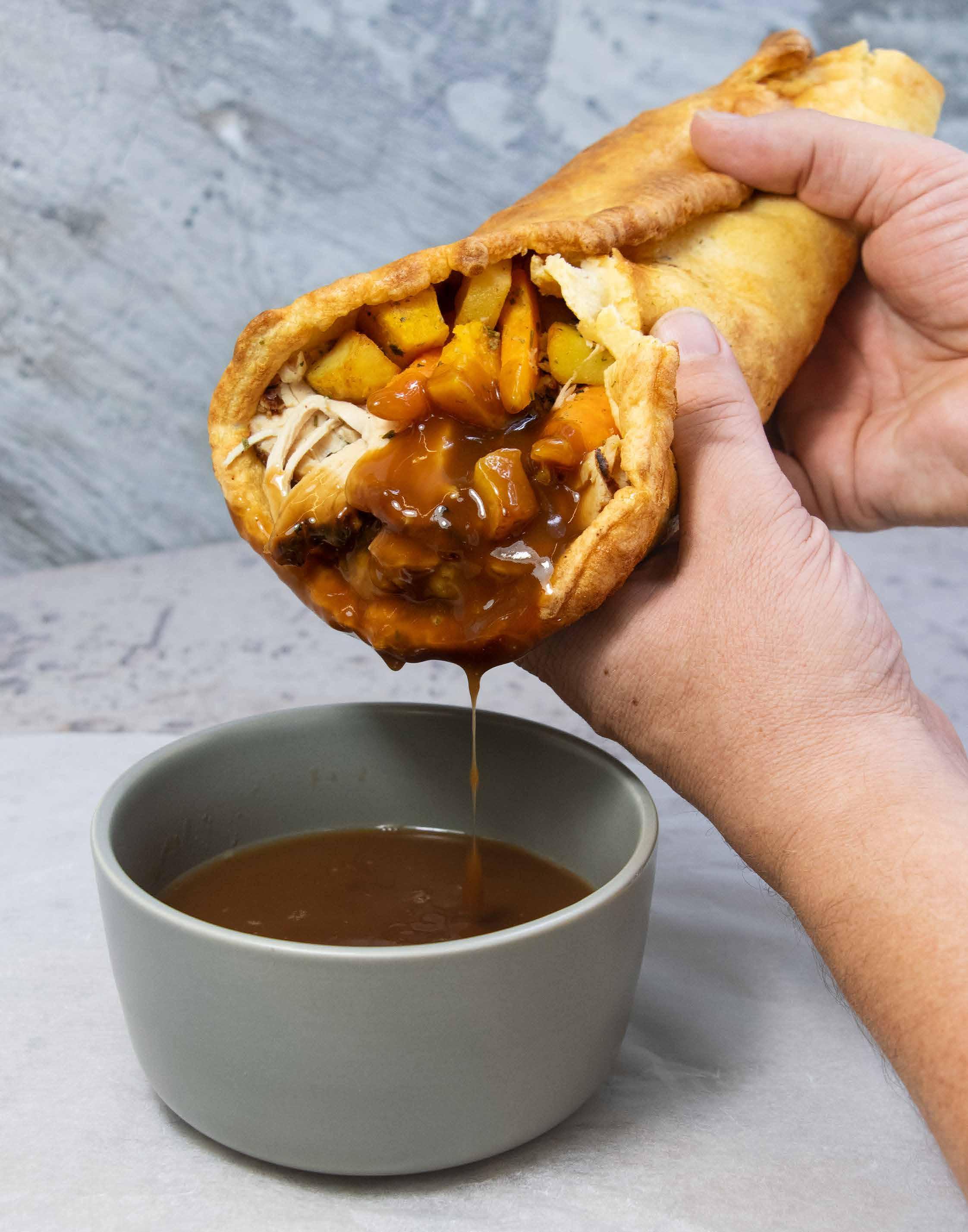 1. Lay a cooled Yorkshire pudding wrap on a board or plate.