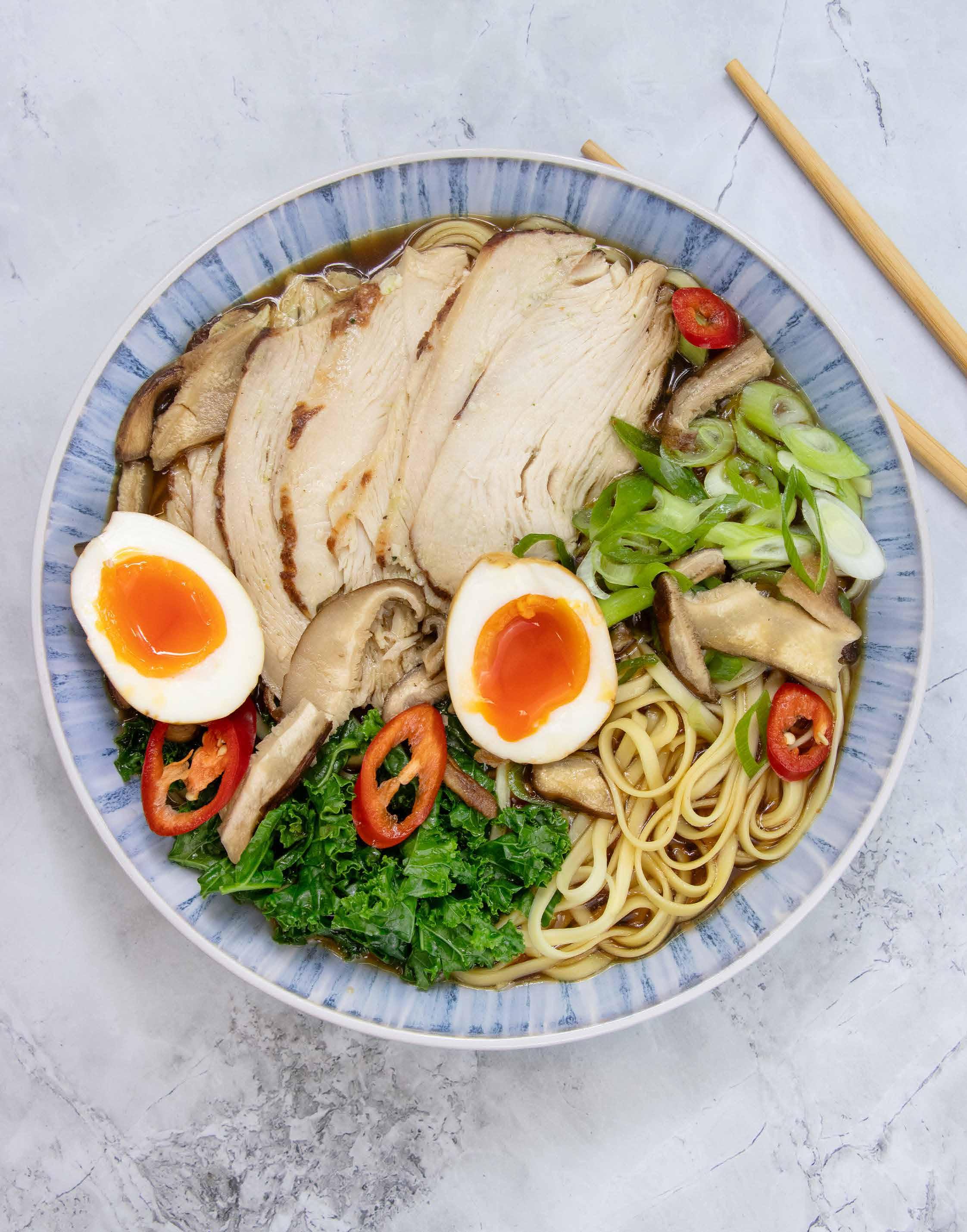 6. Divide noodles and Mt Barker Roast Carved Turkey into bowls, pour over Ramen stock. Top each with a halved soft-boiled egg, spring onion, and optional garnishes like chilli, sesame seeds, or nori, and serve.