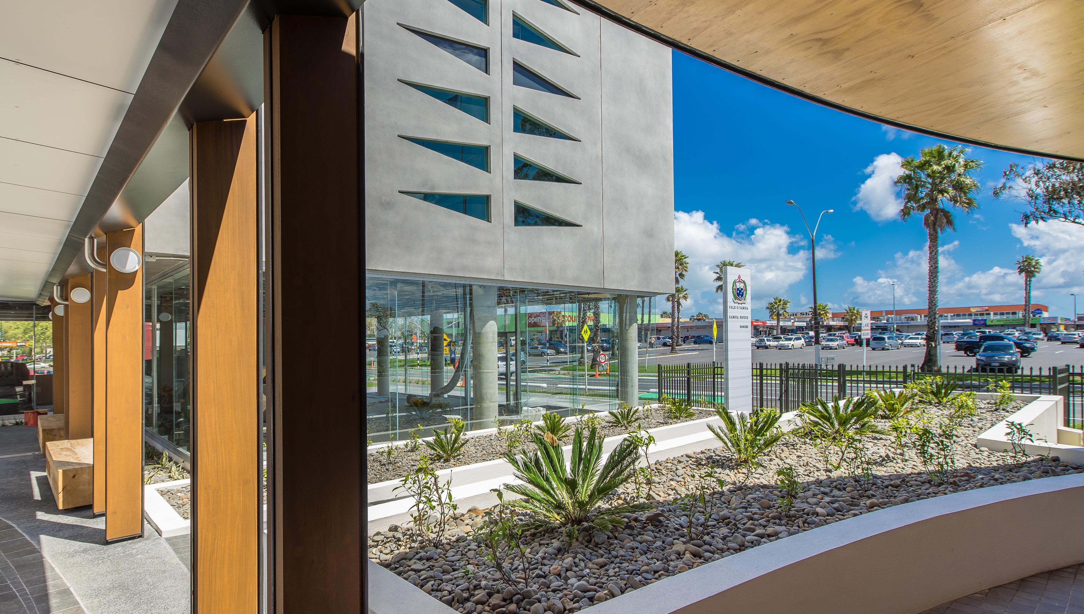 The project consists campus style development with two building, a three level consulate office of approximately 1500 square metres, one level consulate offices, one commercial office floor and a level of ground floor retail, a separate traditional Fale building seating over 450 people which we believe to be the largest in the world, a formal Malae or traditional gathering area and an associated 55 space carpark.
