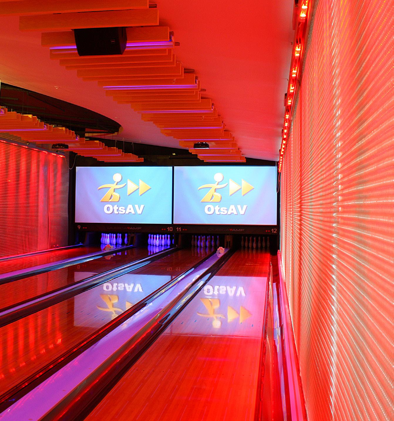 sound transmission to the cinema complex above and to the slab below, to heighten the experience of the ‘strike’ at one end of the lanes and to absorb and quieten the bar and player areas for conversation and social communication at the other end.