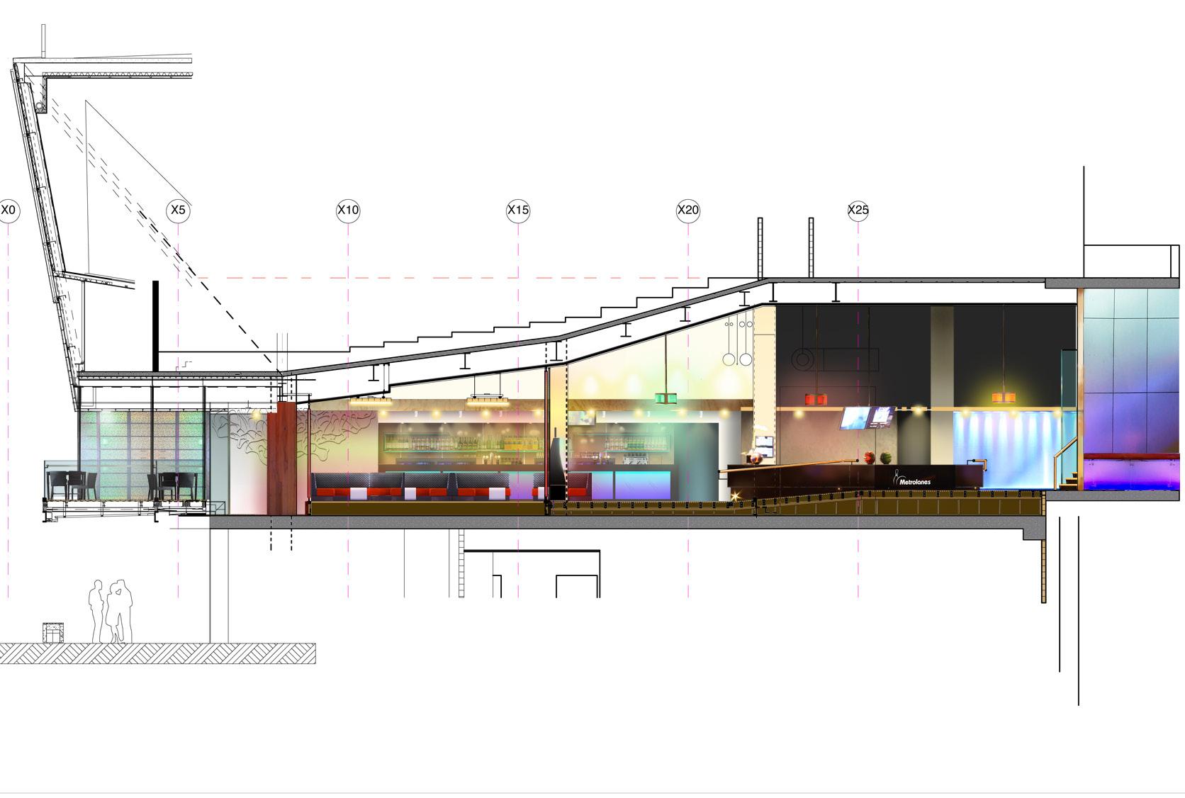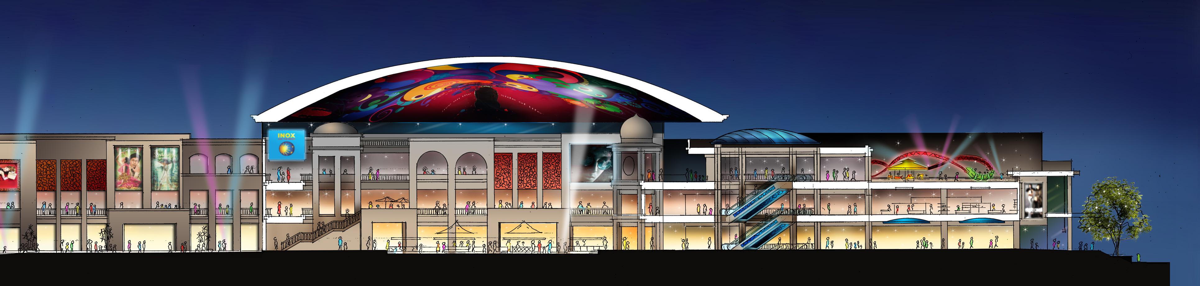 Blurring the lines between entertainment and retail mall, the 8 screen multiplex is on the 3rd floor to one side of a spectacular atrium formed under a dome. On the same floor as the multiplex is typically a cafe court and restaurant bars which step down into a landscaped oasis.