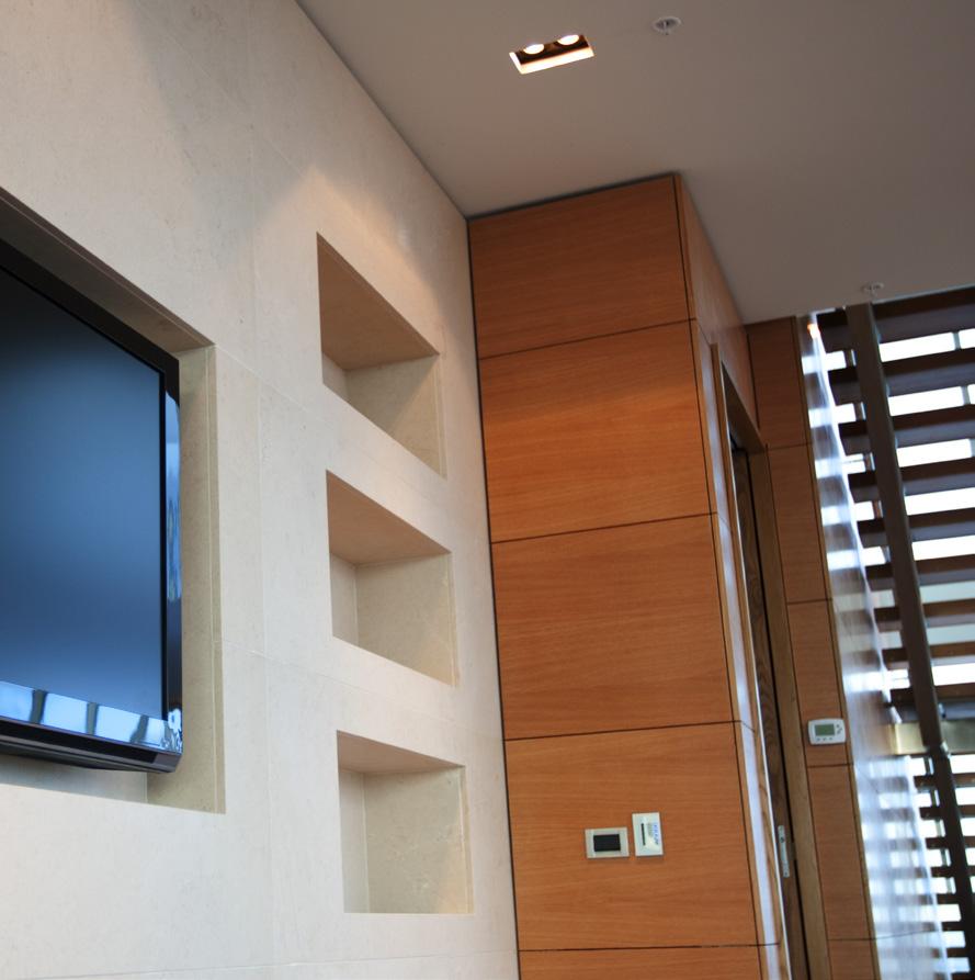 Prestigious fit-out within buildings of Maritime Square. Views down Lighter Key. Designed in keeping with the classic design of the building exterior as a requirement of the brief. Good quality materials, well detailed and well constructed and crafted. The reception and waiting area welcome the visitor, the starkness of the external walls surrounding the warmth and detail of the dark stained timber louvres. The floor and ceiling edges soften in waves, edge dissolved by multiplication. The solid stone block wall behind reception separates the public reception space from the private