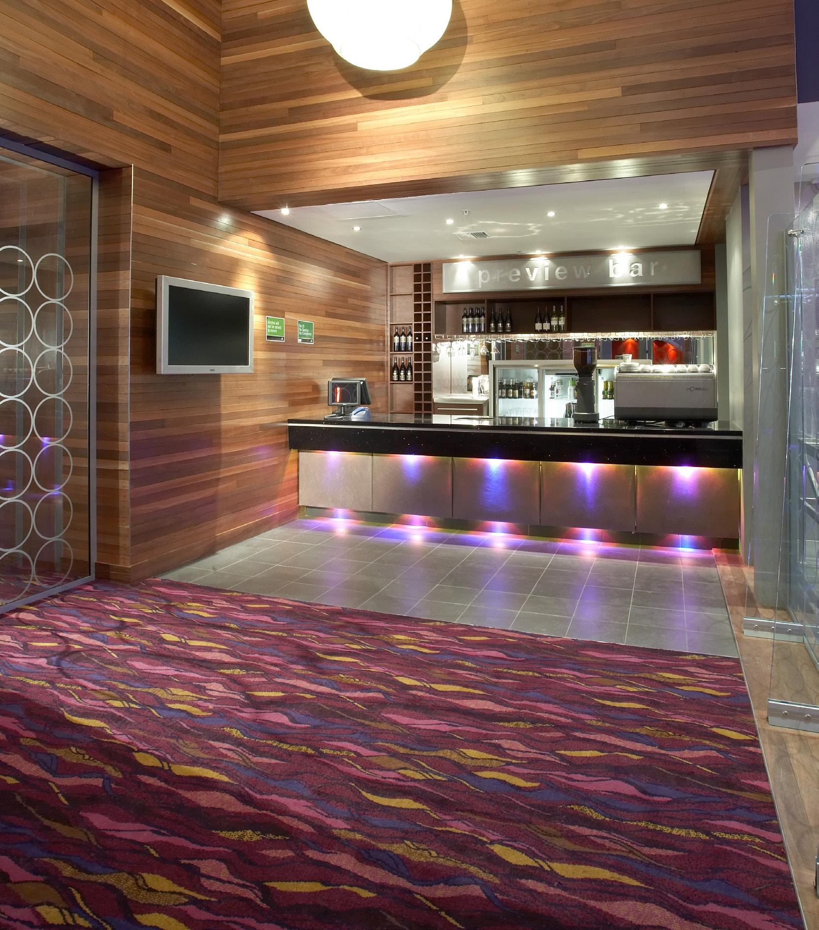 This six screen, 1100-seat complex occupies the first floor level of a multi-storey shopping centre in Bangalore, India. The concept is based around a rich colour scheme of red and blue offset against black and white ceiling and floor backgrounds. Materials were selected to define shape, changing under coloured light. Reflective and repeated shape surfaces multiply images of colour and texture. With very low ceiling heights and unworkable volumes in the shell building, this use of light and colour change give a sense of expanding space and richness of detail to the main ticket and concessions areas.