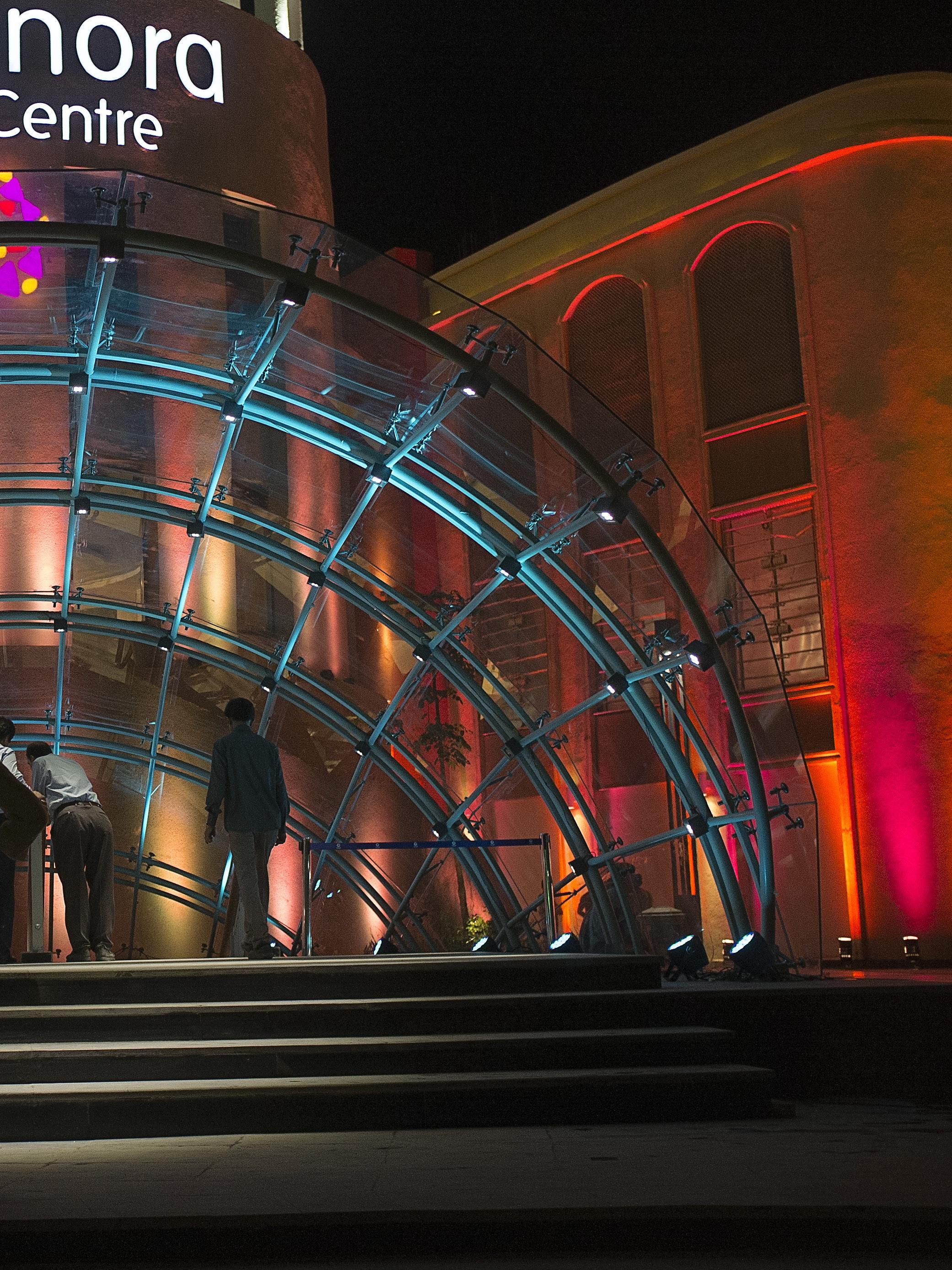 The International Film venue for Goa was put out to all architects as a International Architectural competition. Walkers won, part of the conditions was that the building had to be fully designed and built within eight months of us being awarded the architectural concept. Twenty-four hour a day documentation and design coordination with local architects, made possible by offset time shifts across the globe, helped to achieve the short programme for the successful opening of the complex.