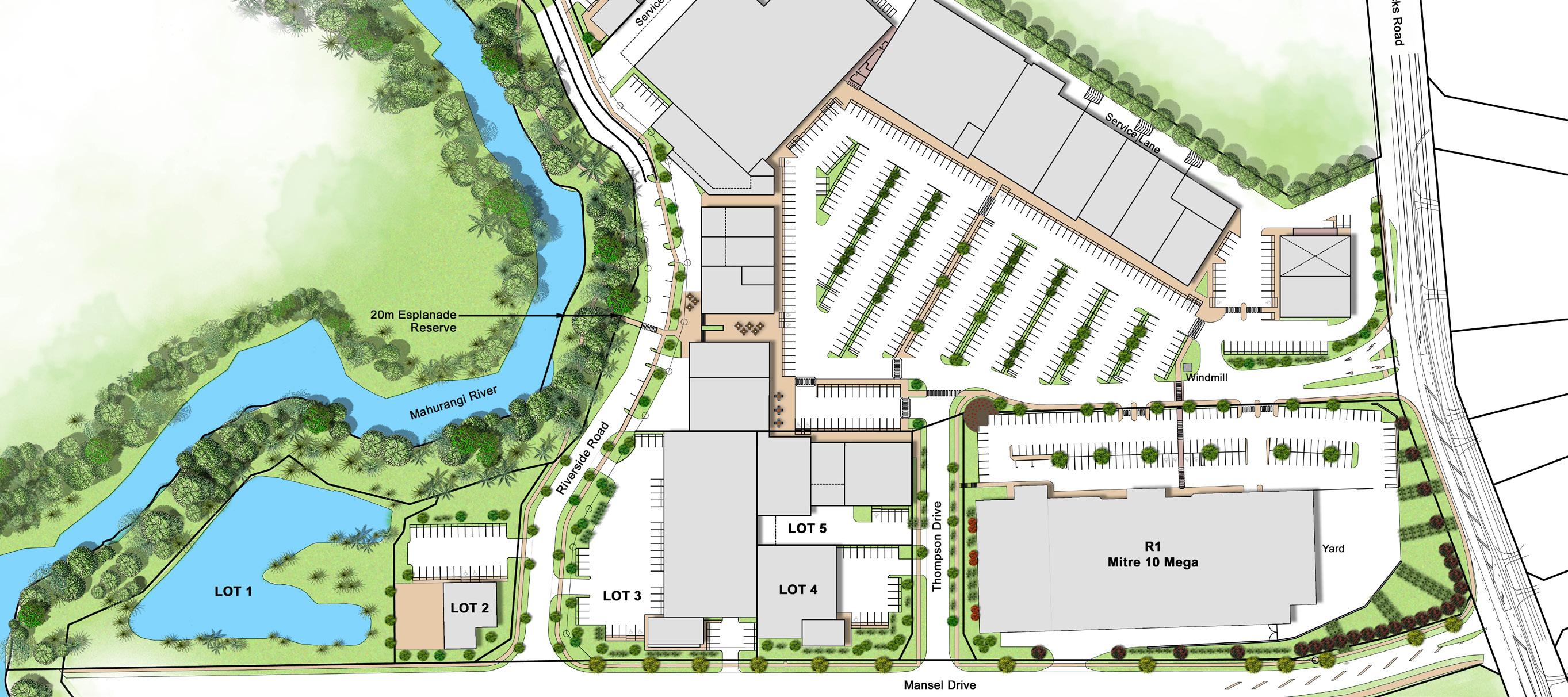An a greenfield site, bordered by existing roads to the West and East and a river to the North, a master plan was drawn up to explore the density of a particular proposed commercial development, for the land owners. The plan included commercial and entertainment buildings, fast food operators and a residential park for the elderly. The rural context dictated the approach to building form and material, density of use to traffic and circulation. This exercise allowed the client to determine the viability of the development to attract commercial operators, to gauge effects on local commercial operations and to assess local authority support prior to exploring development options and resource consents for land use. This project is currently under construction.