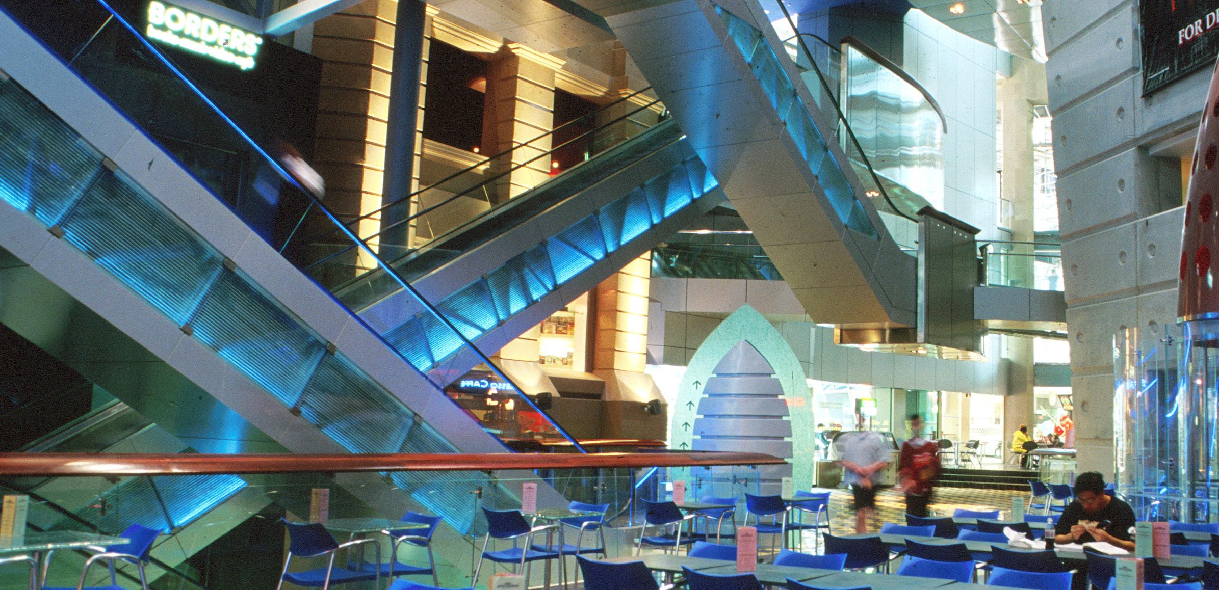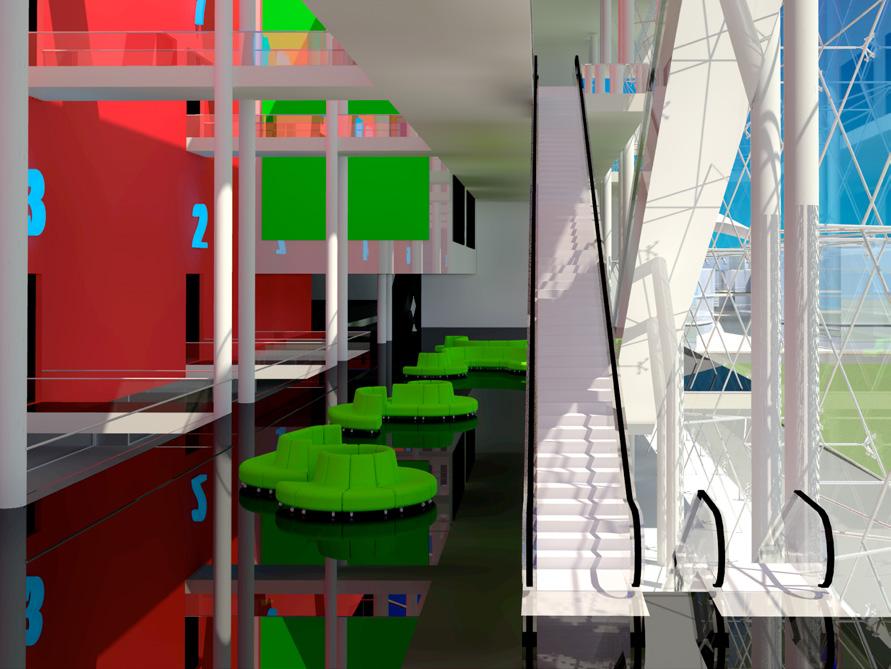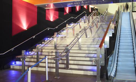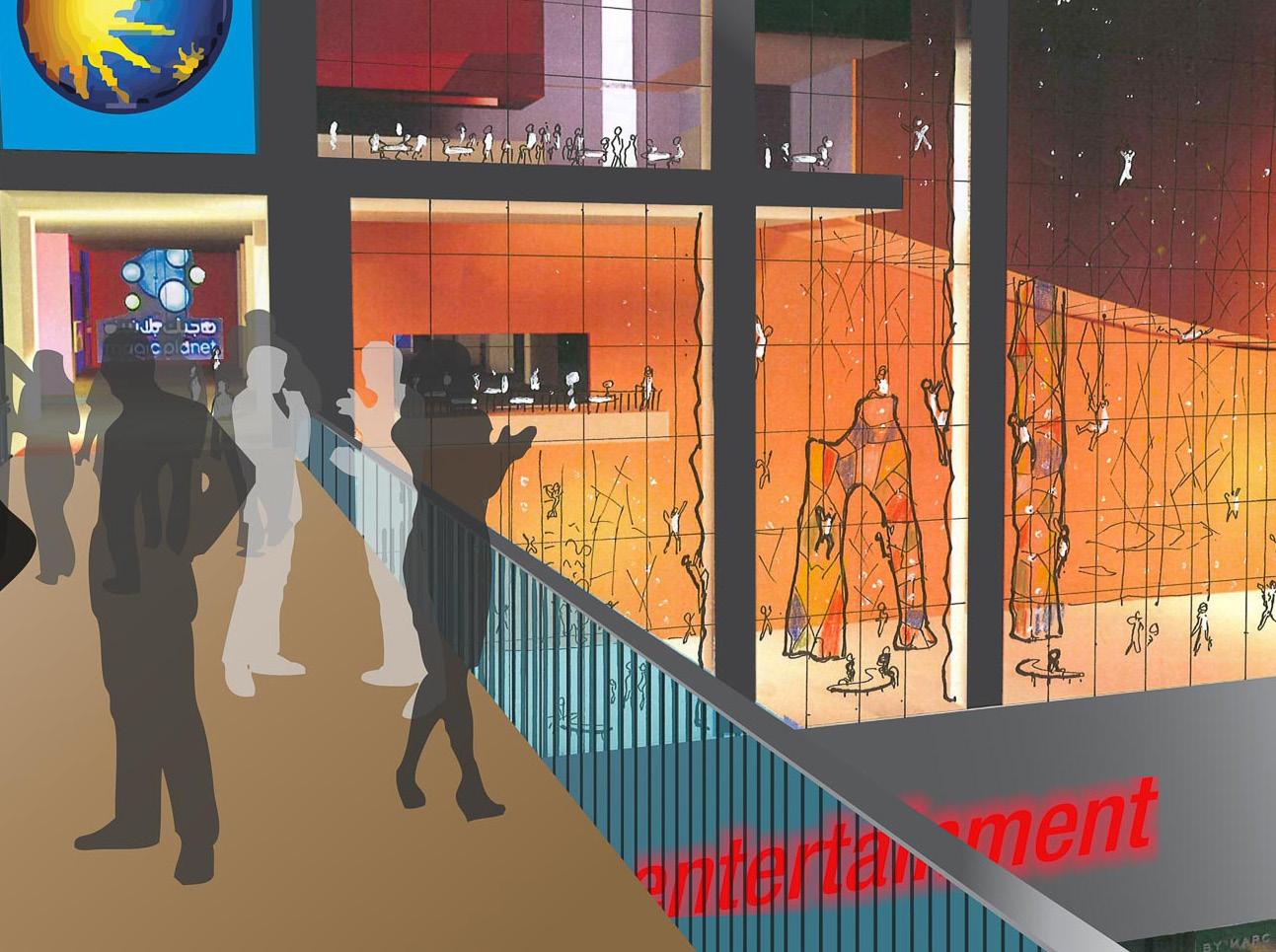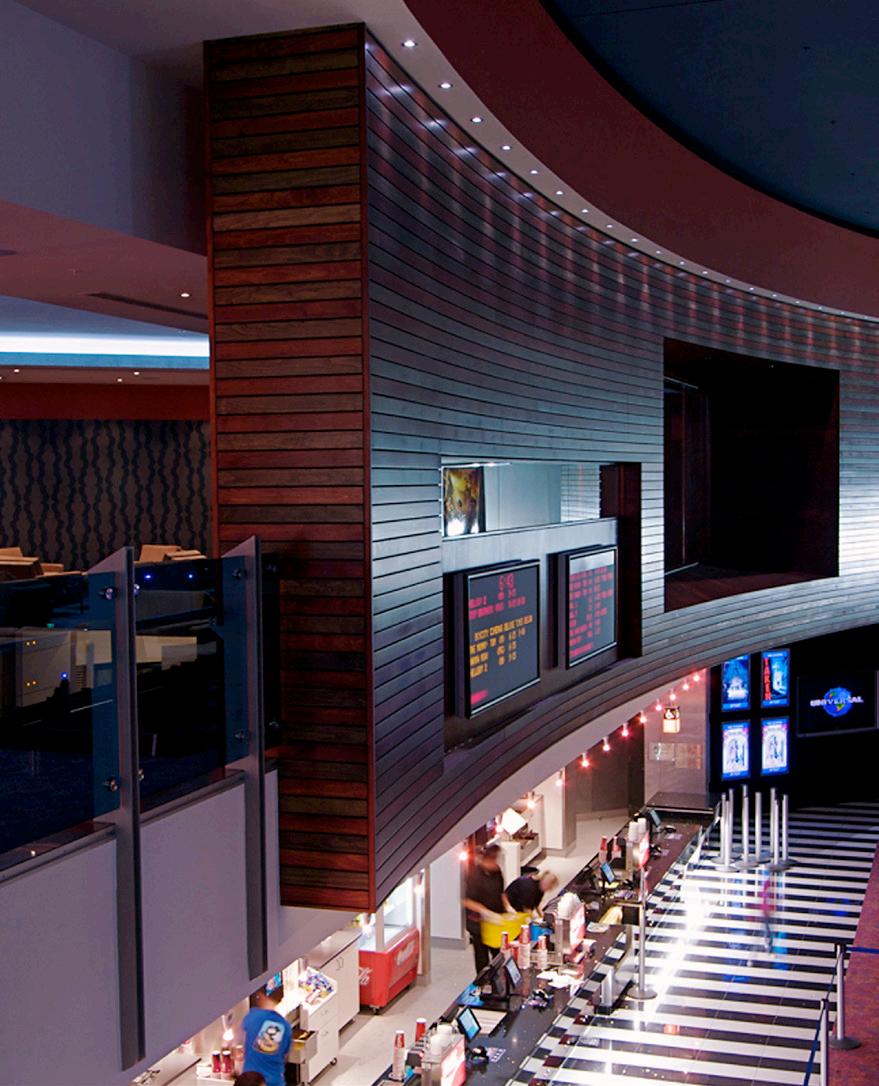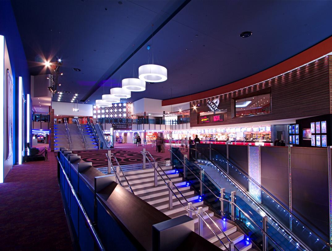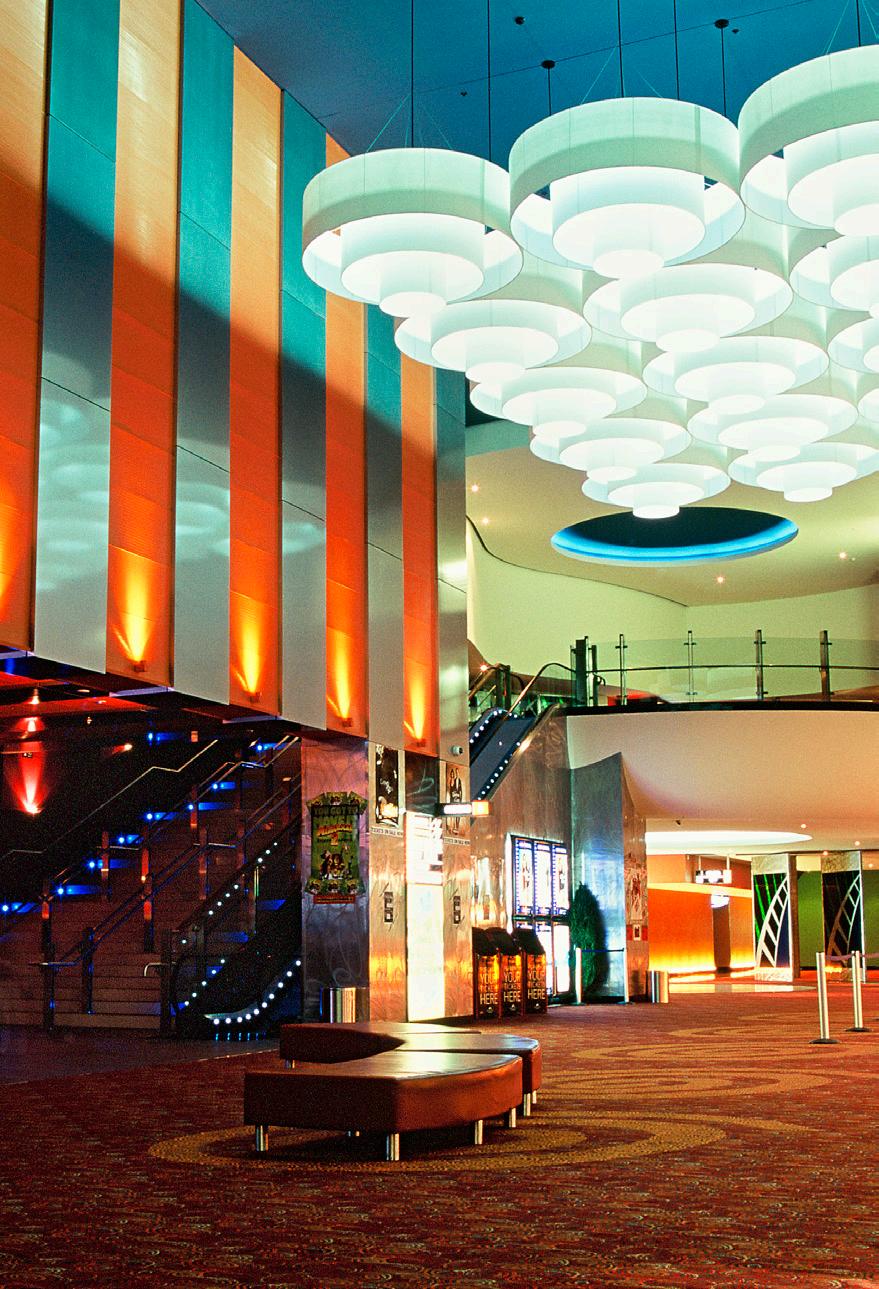 Blurring the lines between entertainment and retail mall, the 8 screen multiplex is on the 3rd floor to one side of a spectacular atrium formed under a dome. On the same floor as the multiplex is typically a cafe court and restaurant bars which step down into a landscaped oasis.