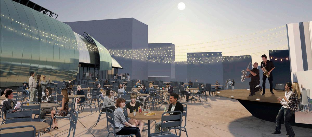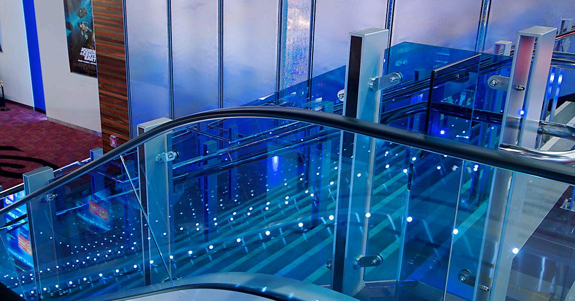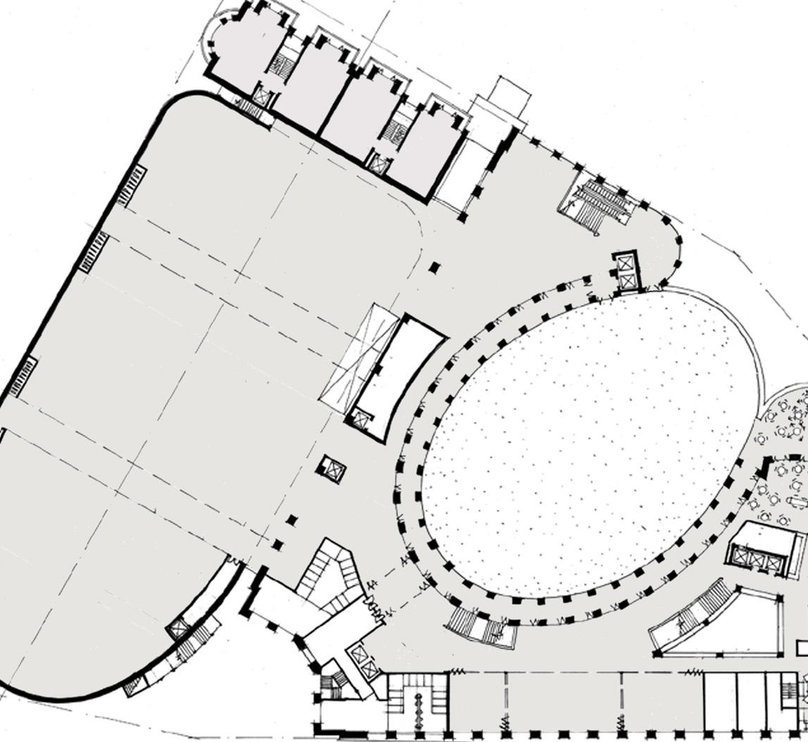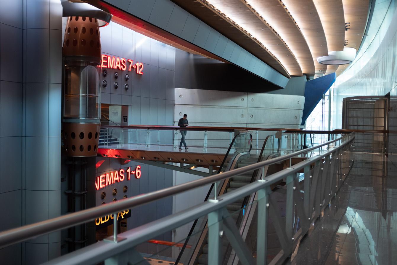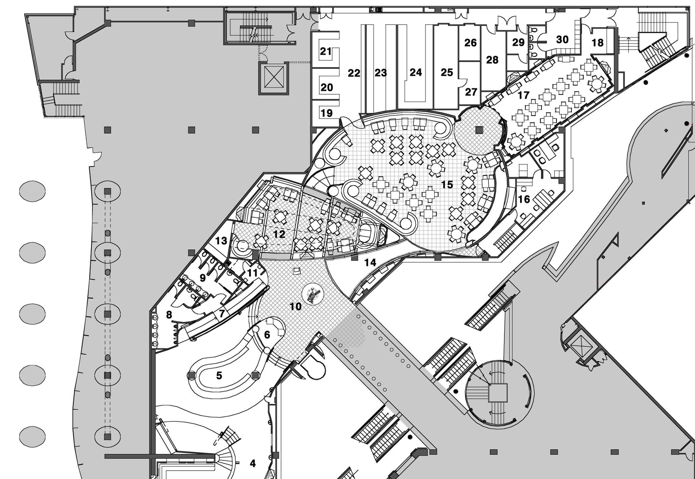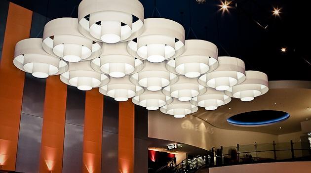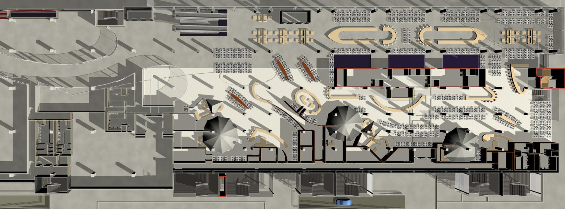 Blurring the lines between entertainment and retail mall, the 8 screen multiplex is on the 3rd floor to one side of a spectacular atrium formed under a dome. On the same floor as the multiplex is typically a cafe court and restaurant bars which step down into a landscaped oasis.