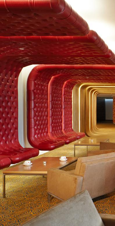 main reception area, one can see over the whole restaurant. The bar area is the holding zone but also, as for each room, functions and feels separate in identity. The various eating rooms are opened up progressively so that patrons always have a degree of intimacy. The multitude of visual displays, both static and digital, draw one around the restaurant due to ‘glimpses’ available from neighbouring rooms.