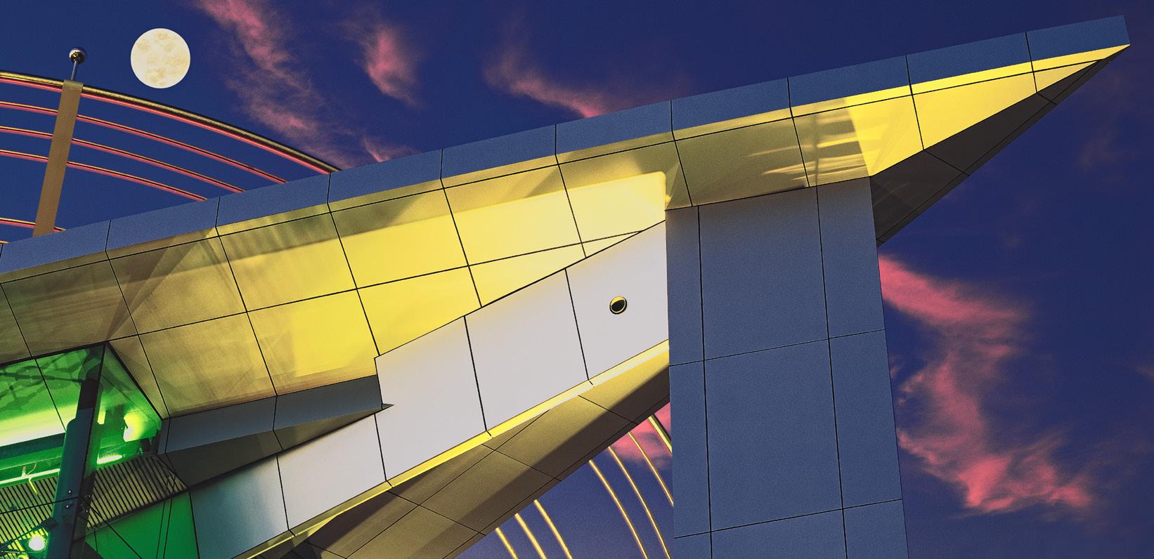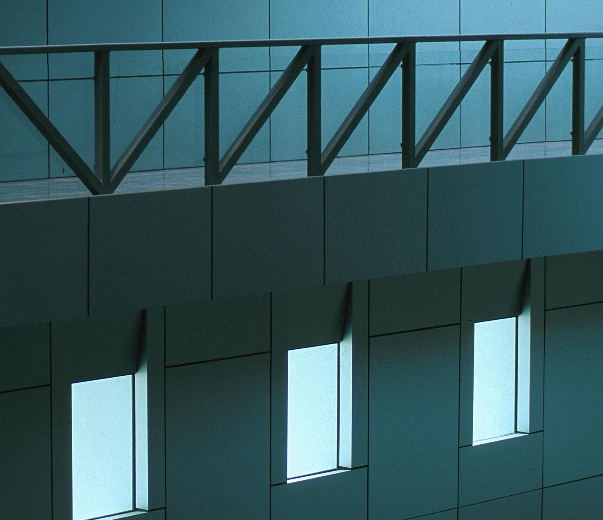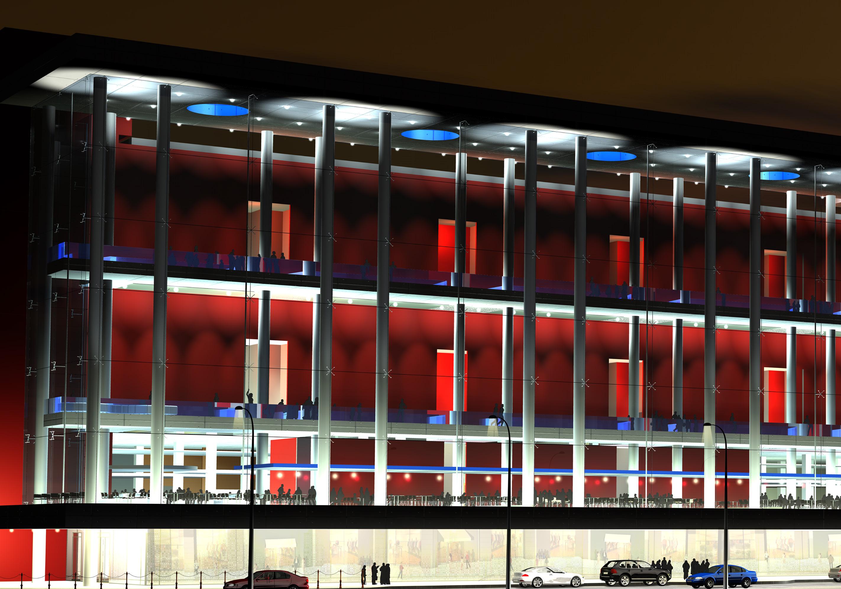 During the day the interplay of light and shade models the building form with its sensuous curves and dynamic overhanging cantilevers. At night the building becomes a lantern accentuating the massing of the building with its solid and void.