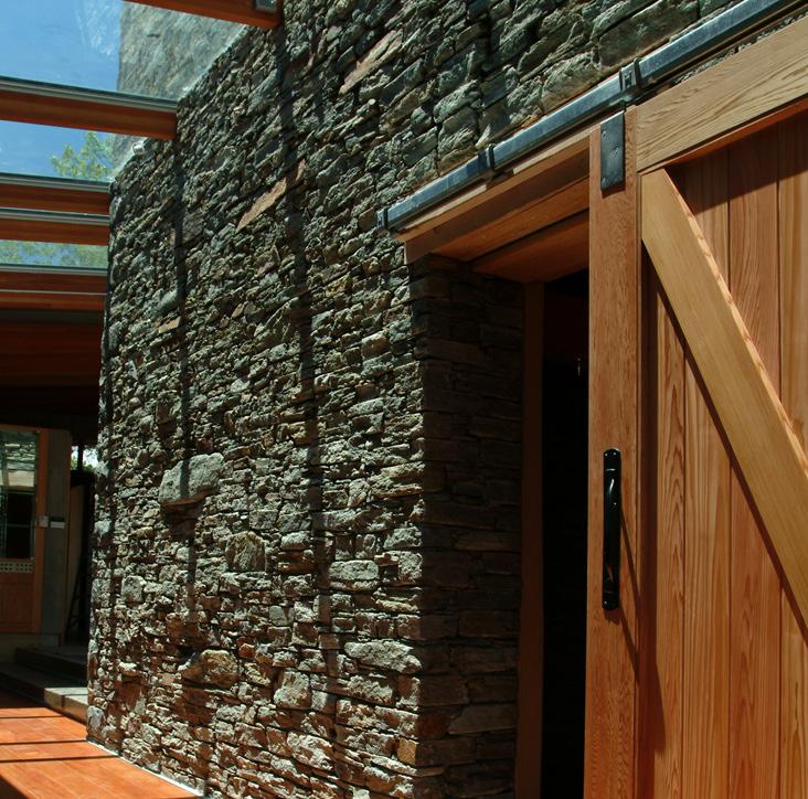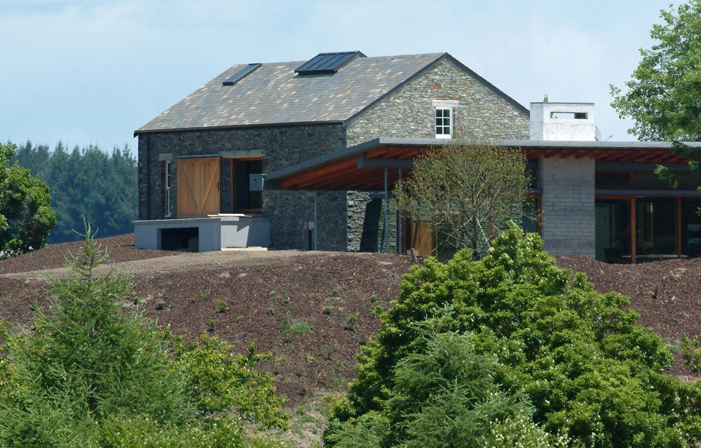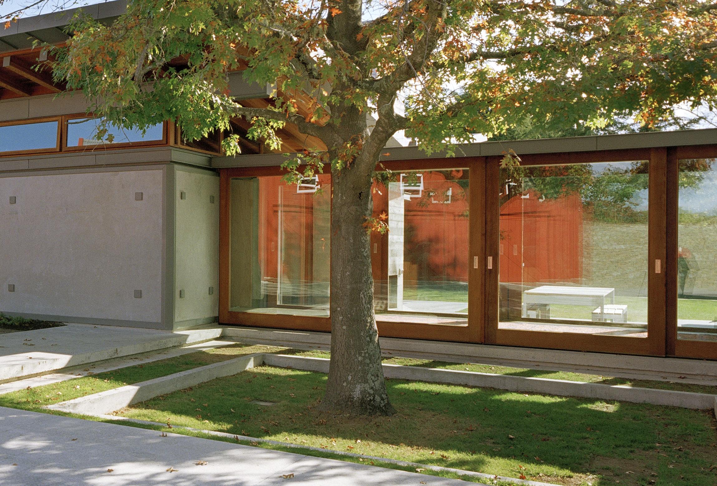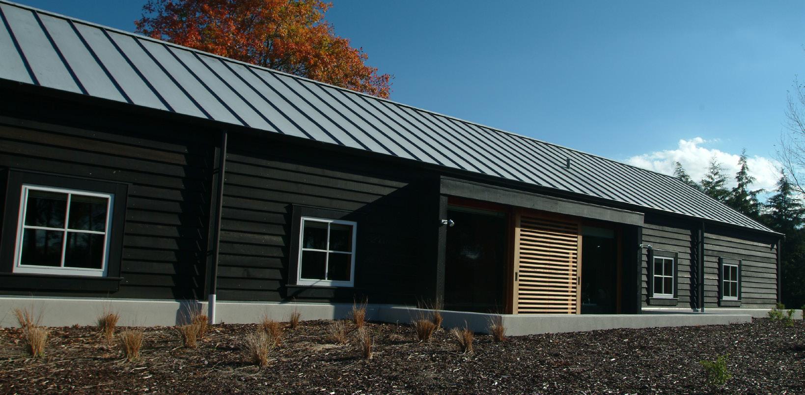 has an oak tree located on the key axis of the buildings which acts as both a link to the seasons and as a blurring of the line between architecture and nature. The collection consists of four buildings; a red cedar structure as the shed, a stone building as the entry as well as an anchoring feature on the site, a modern glass and timber pavilion containing the living areas, and a black cedar guest wing. Creating a sense of establishment on the site has been crucial in the design.