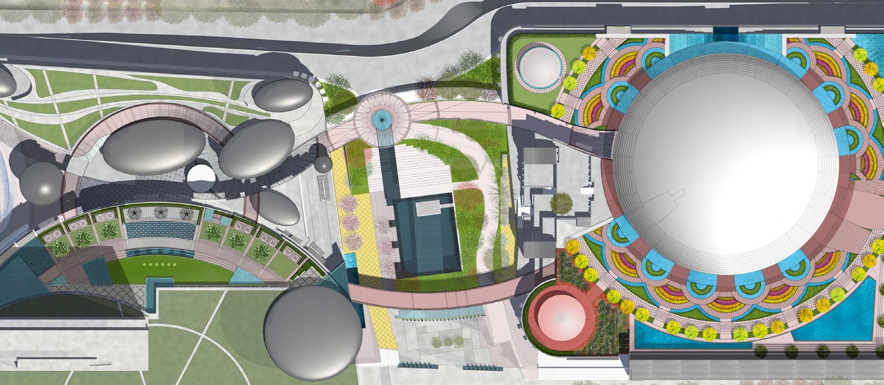 Separated by a main road into Amanora Park Town. The ground sweeps up as one curve from each side to give a recognisable simple iconic form, creating a gateway to the Park Town. The landscaping of this man made continuation of the ground is indicative of the sweep from the valley lake up to the mountains. Floating above and punctuating through