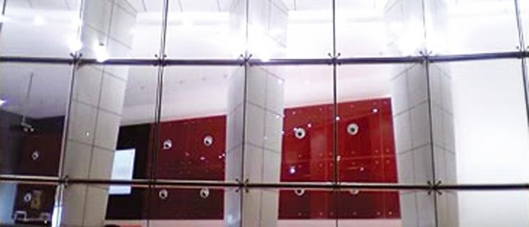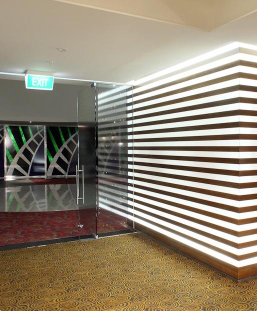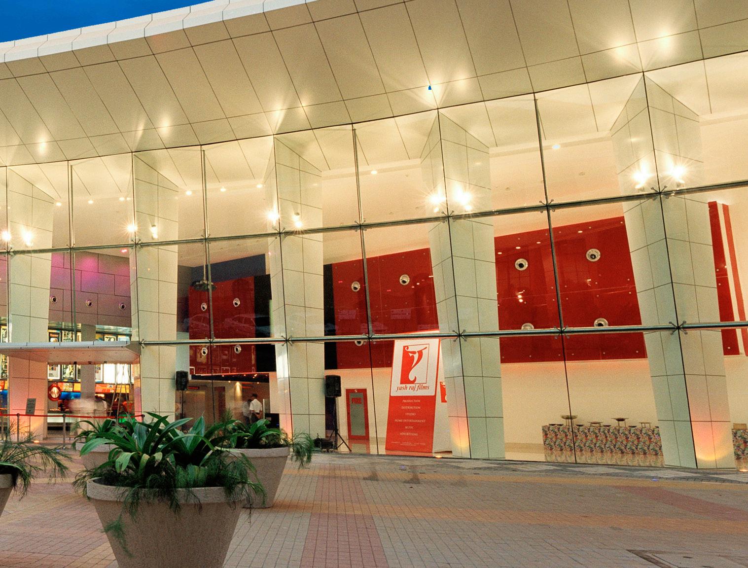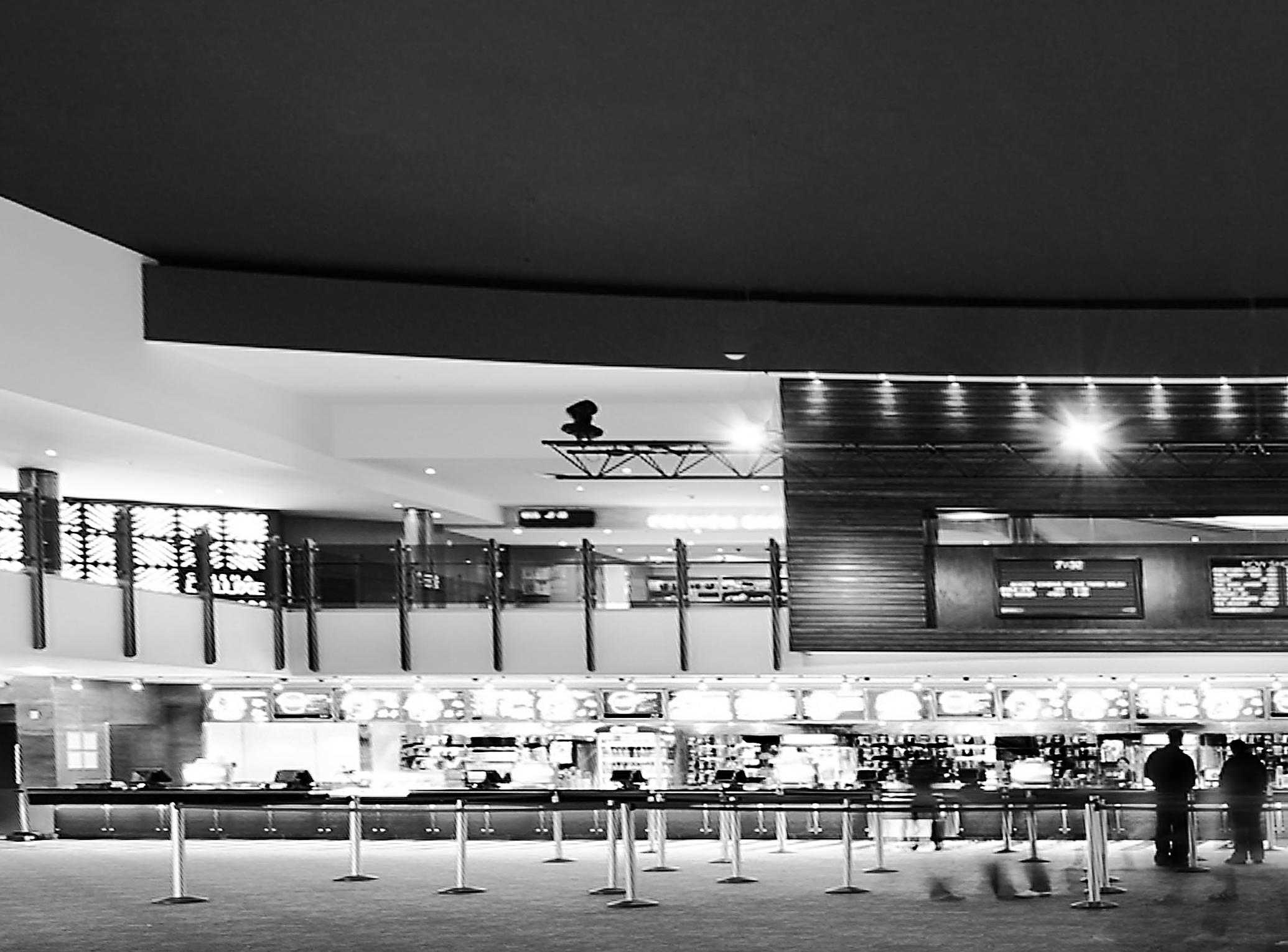 This six screen, 1100-seat complex occupies the first floor level of a multi-storey shopping centre in Bangalore, India. The concept is based around a rich colour scheme of red and blue offset against black and white ceiling and floor backgrounds. Materials were selected to define shape, changing under coloured light. Reflective and repeated shape surfaces multiply images of colour and texture. With very low ceiling heights and unworkable volumes in the shell building, this use of light and colour change give a sense of expanding space and richness of detail to the main ticket and concessions areas.
