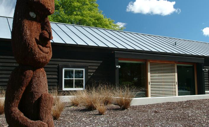 river. The upturned roof tips to acknowledge the mountain side forces around the promontory site. Its underside, viewed from the river below, is furrowed like the underside of a jet boat, to grip the water. From the mountains above it appears as a saddle, a waka moving down the river gorge. A Pounamu greenstone welcomes the visitor. The very first jet boat used on the river is the reception counter and focus. Sweeping views surround the visitor on all sides with invitation to see, hear, touch and move as part of the rushing and ebbing ‘river jet boating’ experience.
