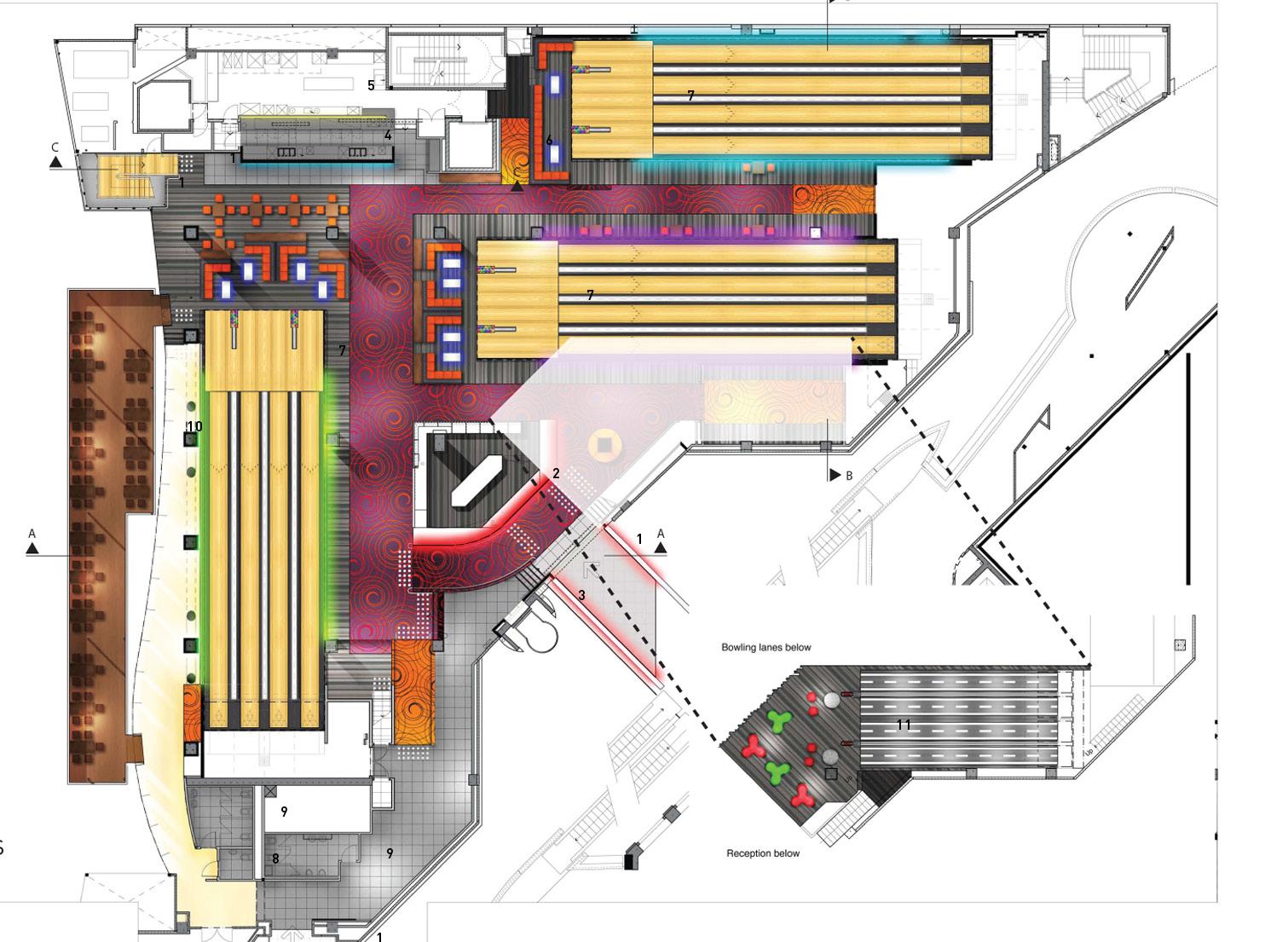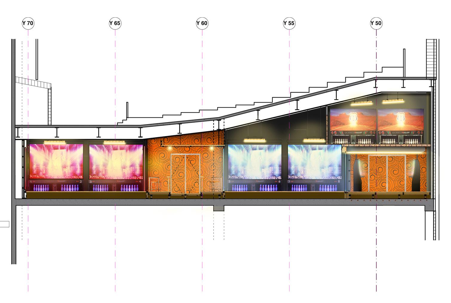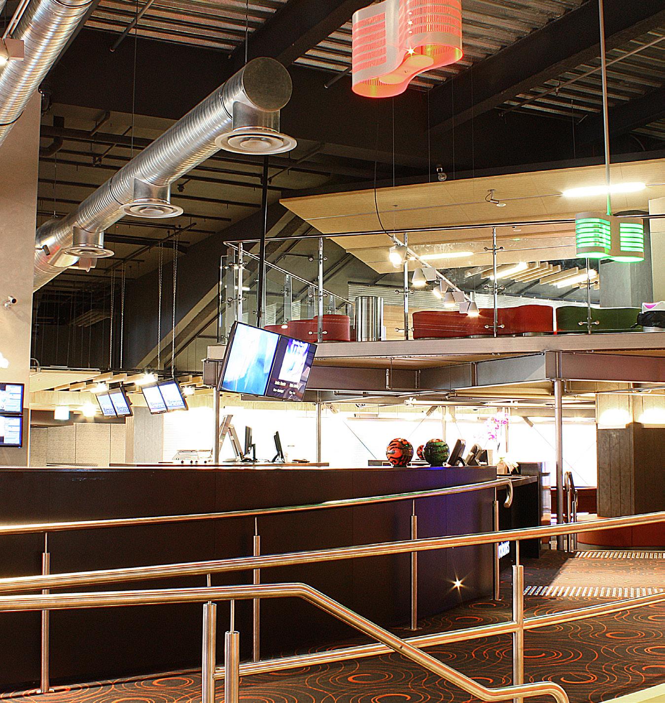 The new owners of the Metro Centre in Auckland wanted to strip out 1400m2 of a large volume area for a socially relaxing 10 pin bowling experience focused around a simple food and drink operation and which can also be used for international standard competition.