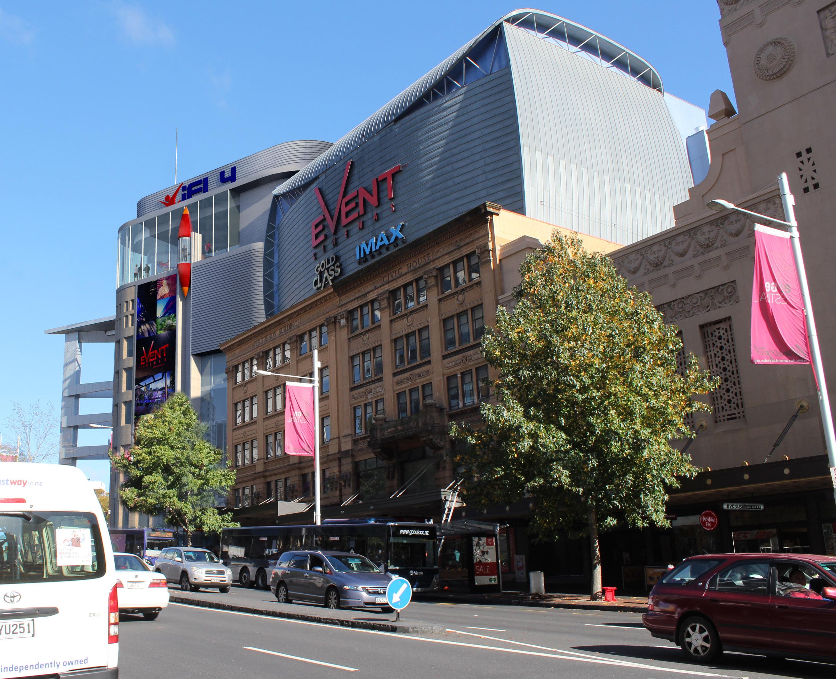 the notion of entertainment. The building is incorporated into the entertainment hub known as The Edge. The building footprint fronts onto Aotea Square, Bledisloe Concourse, Queen Street and abuts The Civic Theatre, with which it shares loading facilities. The tall, narrow, aerofoil plan shaped atrium runs in a strong diagonal across the complex and serves as a pedestrian link in lieu of the original streets. . With walls and roof of the same material it appears like an alien