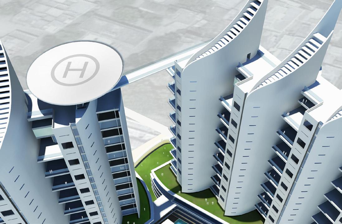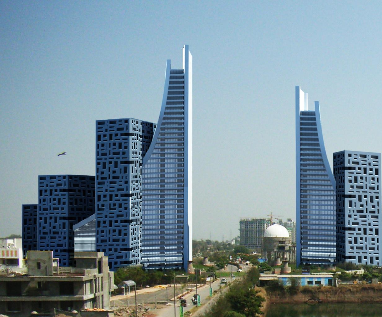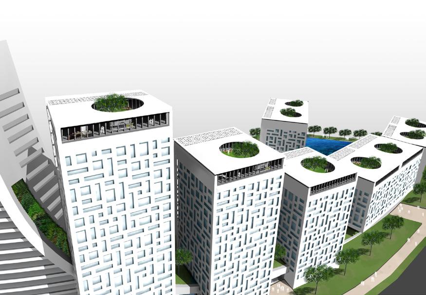 this sweep are individual recognisable simple apartment blocks. Each with separate atrium entries. Although these work together with the total to form 100m to 150m height at the road of the entry, owners can identify and easily access their apartment. Multiple apartment type offerings from down by the water, park settings, tower and penthouse landscape villas are offered. Total building area for both sites 170,000 square metres. Amanora Park Town Apartments Pune, India.