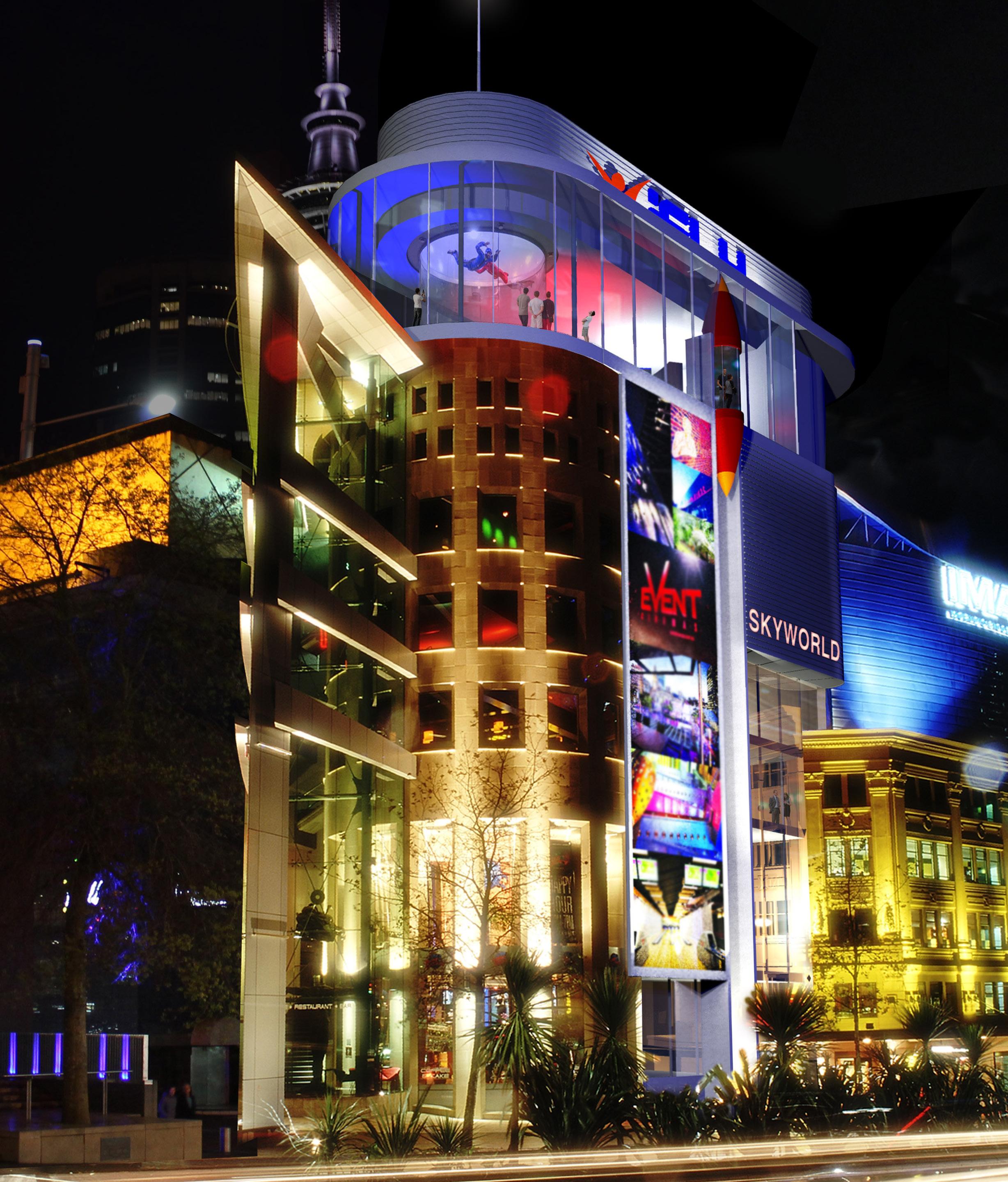 Skyventures & iFLY world selected Walker Commercial Architects to facilitate this process in Auckland, New Zealand, because of their experience with tourism, retail and entertainment projects in the region as well as their ability to work successfully with multinational clients. The “clip on” addition provides a landmark for entertainment, the external rocket lift and glazed flying zone provides activity and a true entertainment factor to the centre of the city.