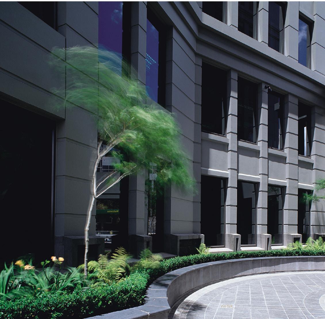 office activities down to this man-made edge, to extend the city business district down to the urban water edge. The result is a development which can recall the buildings of the past, with their solid in-situ concrete walls, small individual windows in classic orders and solid banded bases supported on basalt as the buildings of old, a place that you would expect to still be here in 100 years.