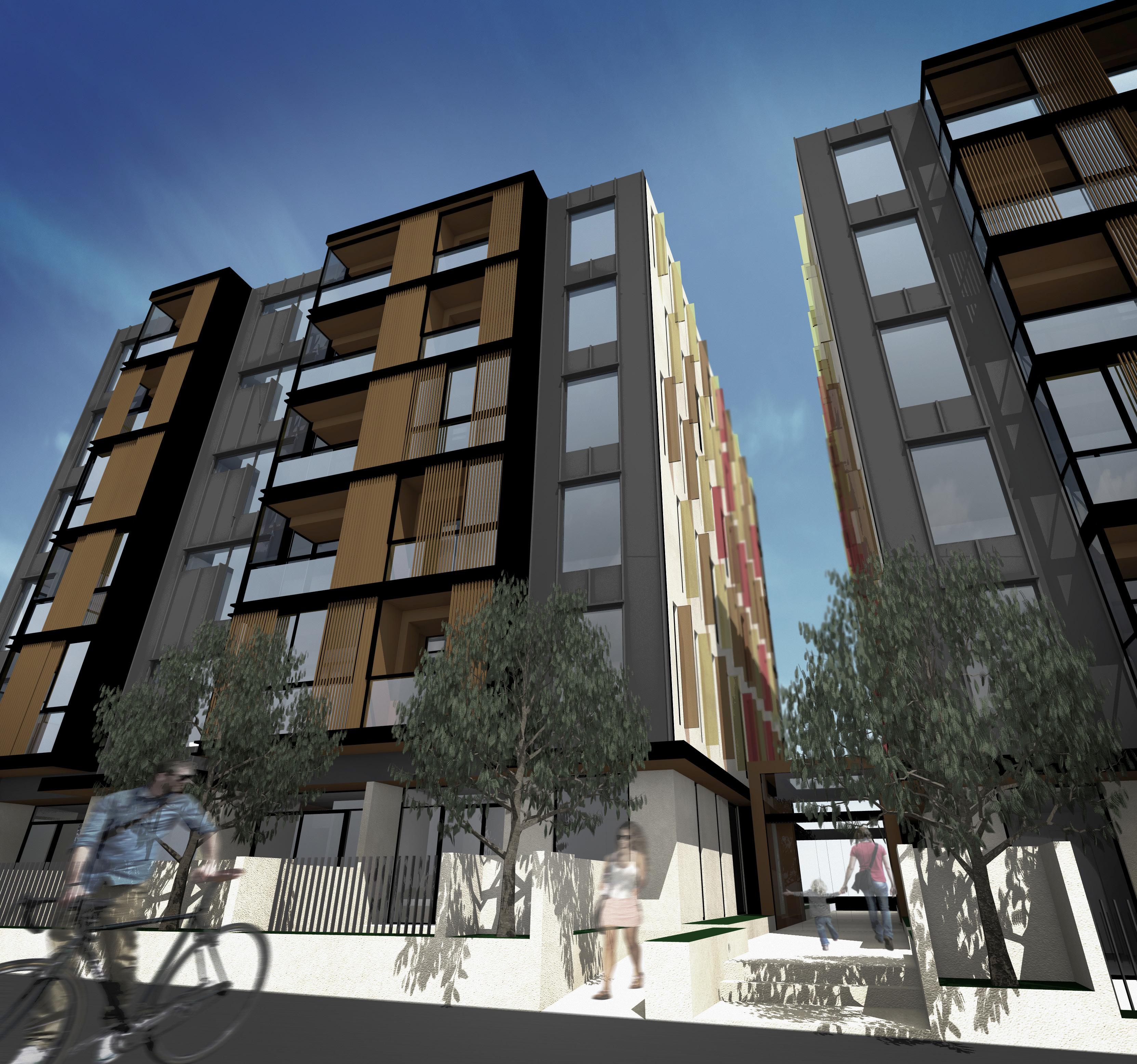 Our commission was to provide a master plan of the entire block comprising eight apartment blocks. The first stage comprised 2 of our highly efficient and compact apartment towers. The design has a central core minimising the common space and helping gain maximum returns for the developer. Due to its great location, the units were designed to maximise the outlook and privacy. The careful use of economical materials with a few quality natural highlight materials provides an elegant building with a distinctive New Zealand presence.