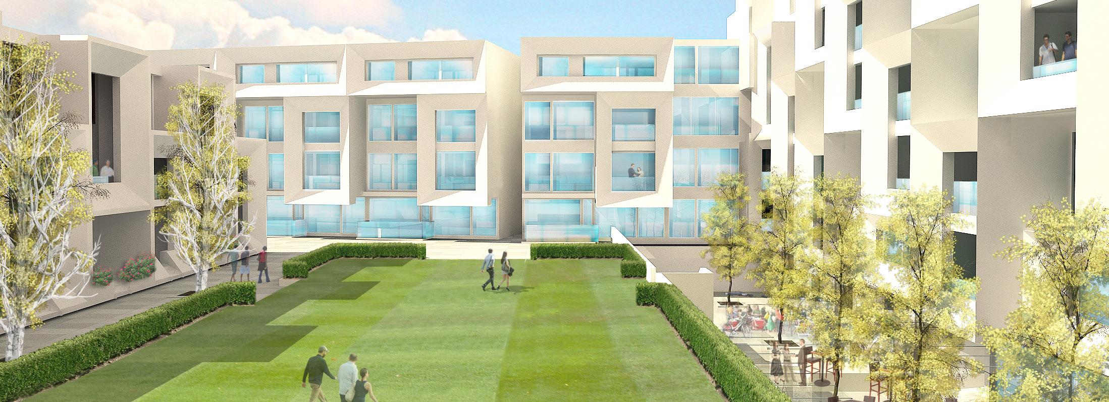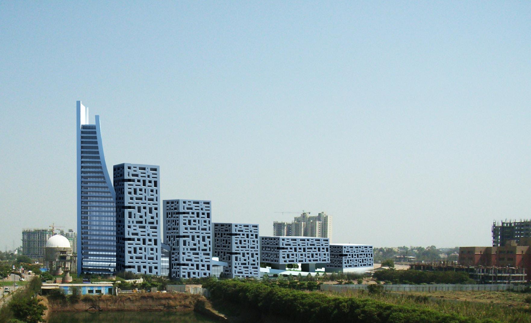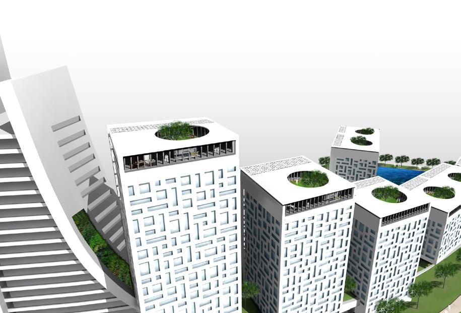 New apartment buildings occupying two large sites. Separated by the main road into Amanora Park Town. The ground sweeps up as one curve from each side to give a recognisable simple iconic form, creating a gateway to the Park Town. The landscaping of this man made continuation of the ground is indicative of the sweep from the valley lake up to the mountains. Floating above and punctuating through this sweep are individual recognisable, simple apartment