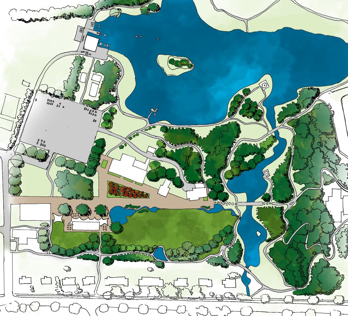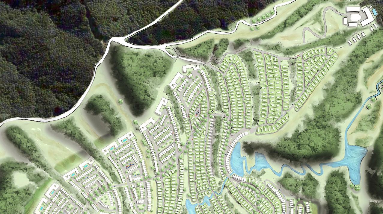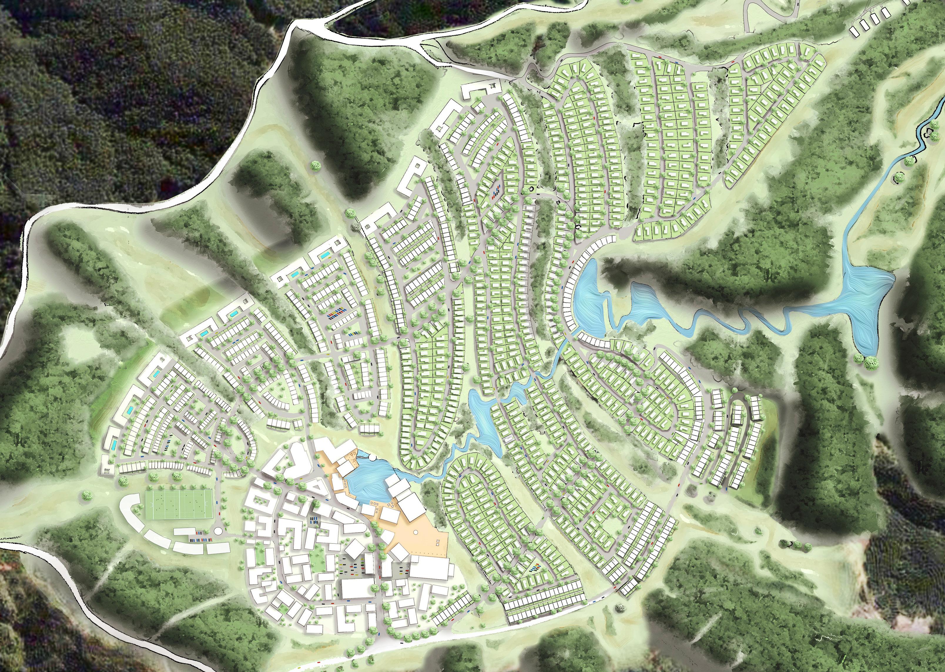 The master plan encompasses a large central park as a focus where developments will eventually align.