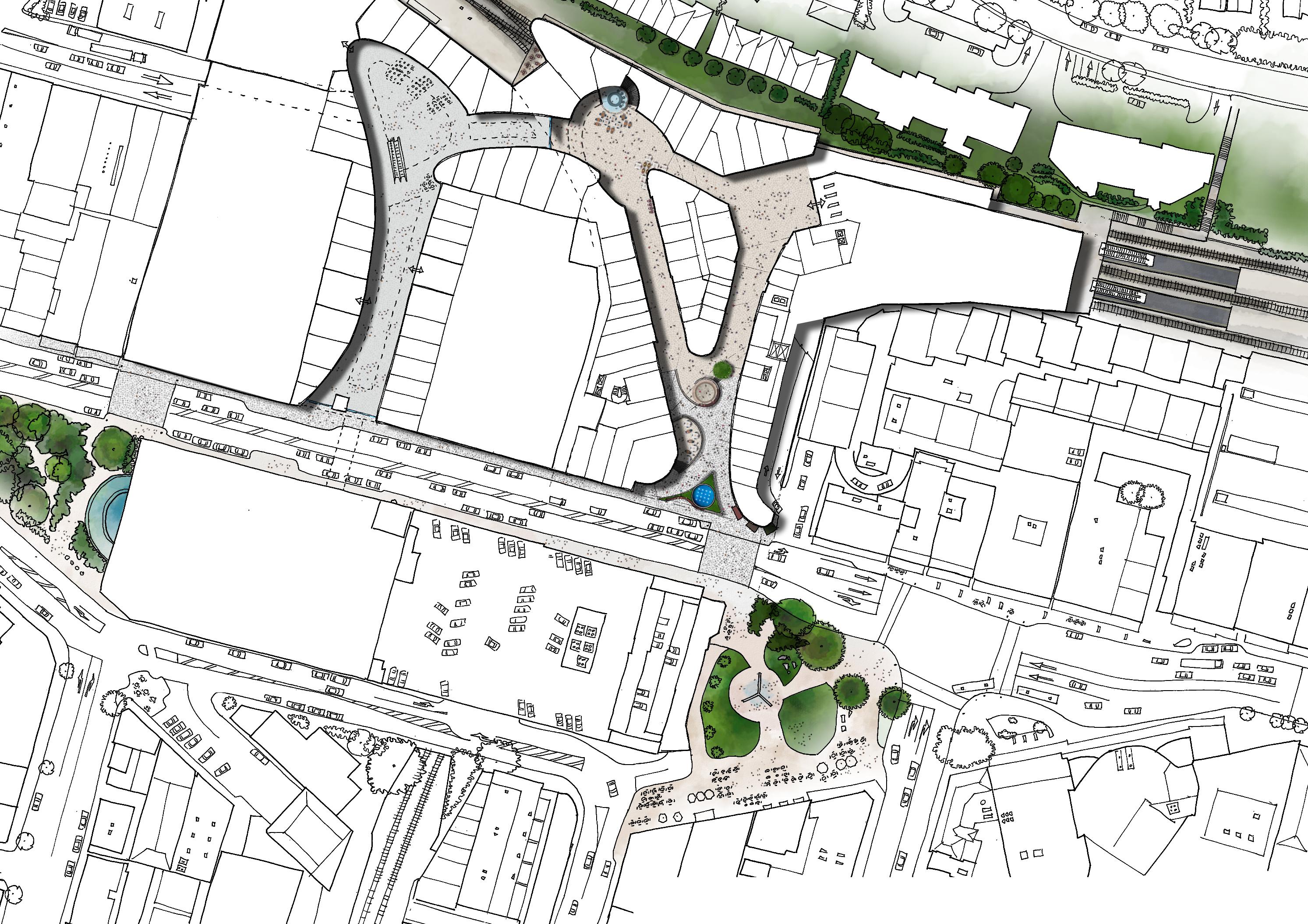 Amixed use development on a new platform utilising airspace above the existing Newmarket railway triangle compromises retail pedestrian streets. In a circuit with connection to Broadway’s Lumsden Green and Newmarket Railway Station. Retail predominantly on podium level with gentle flow from Broadway street level.