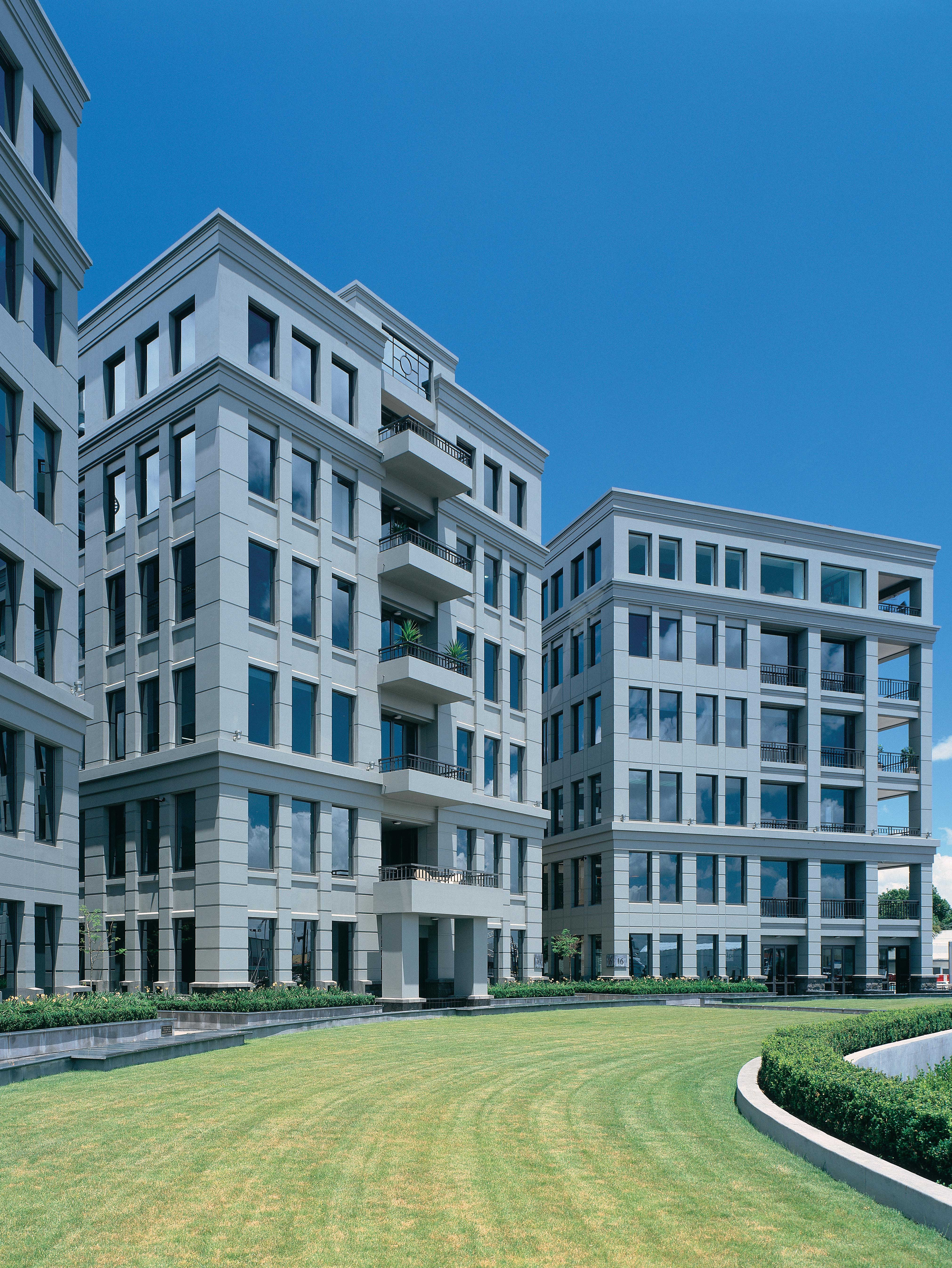 blocks. Each with separate atrium entries. Although these work together with the total to form 100m to 150m height at the road of the entry, owners can identify and quickly access their apartment. Multiple apartment type offerings from down by the water, park settings, tower and penthouse landscape villas are offered. Total building area for both sites 170,000 square metres. Amanora Park Town Apartments Pune, India.
