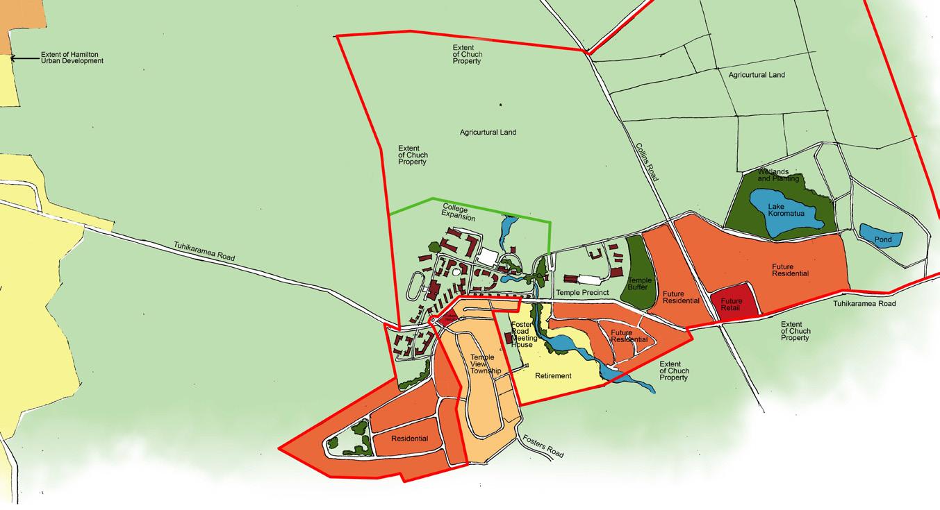 Concepts for a landscaped central community area, as part of the overall future Temple View development, incorporating existing historic buildings along with new buildings. With strong visual links back to, and from, the Temple there was great emphasis on the creation of a beautiful picturesque setting. The new buildings were required to be in sympathy with the existing historical buildings as well as be human in scale. Incorporating a man made lake with cafe, museum , community hall, library and outdoor amphitheater it was hoped to achieve a tranquility that reinforced community as well as peace and reflection.