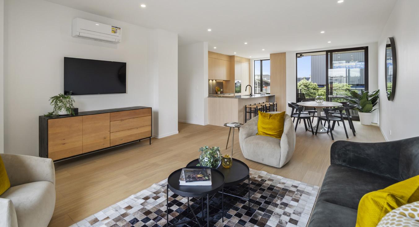 Six level 157 unit residential apartment and town house development grouped around a landscaped plaza. The development sits on top of a new podium built above the Newmarket Triangle railway junction. It incorporates retail along Broadway at street level and along a pedestrian access to Newmarket railway station.