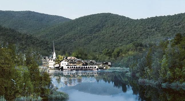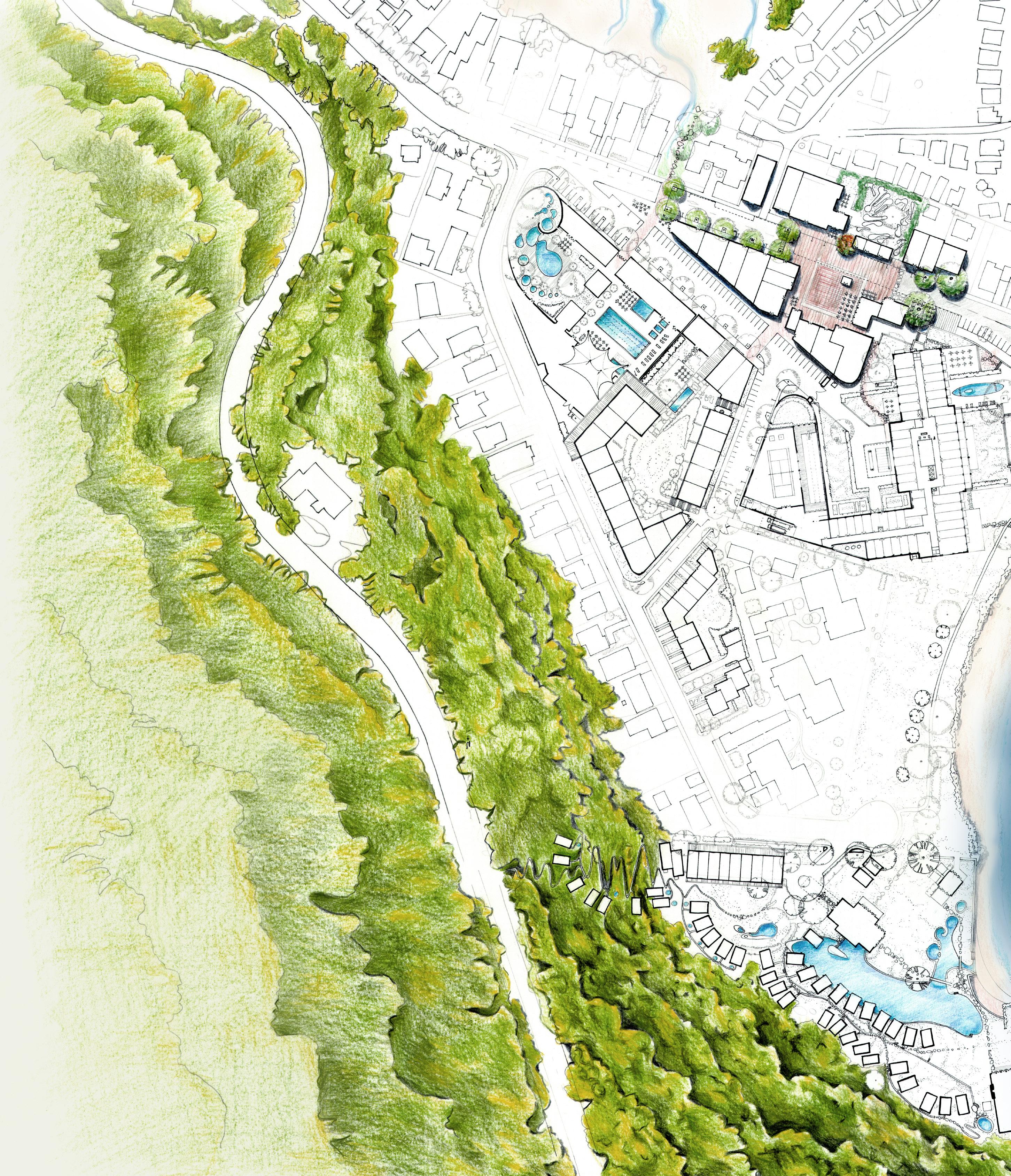 The intent in this design is to provide Waiwera a heart, a place where a variety of activities can occur, markets, car boot sales, musical events, etc this main space takes the form of a village square where traffic still passes across the northern edge on shared vehicle and pedestrian paving. This intermarrying also adds life and activity to the square. A increase in easily accessible street car parks close to the square is achieved on the secondary road which services the pools, brewery and apartments. At the end of this part of the road is the formal hotel entry court. The car park associated with the hotel also provides greater parking at peak times.
