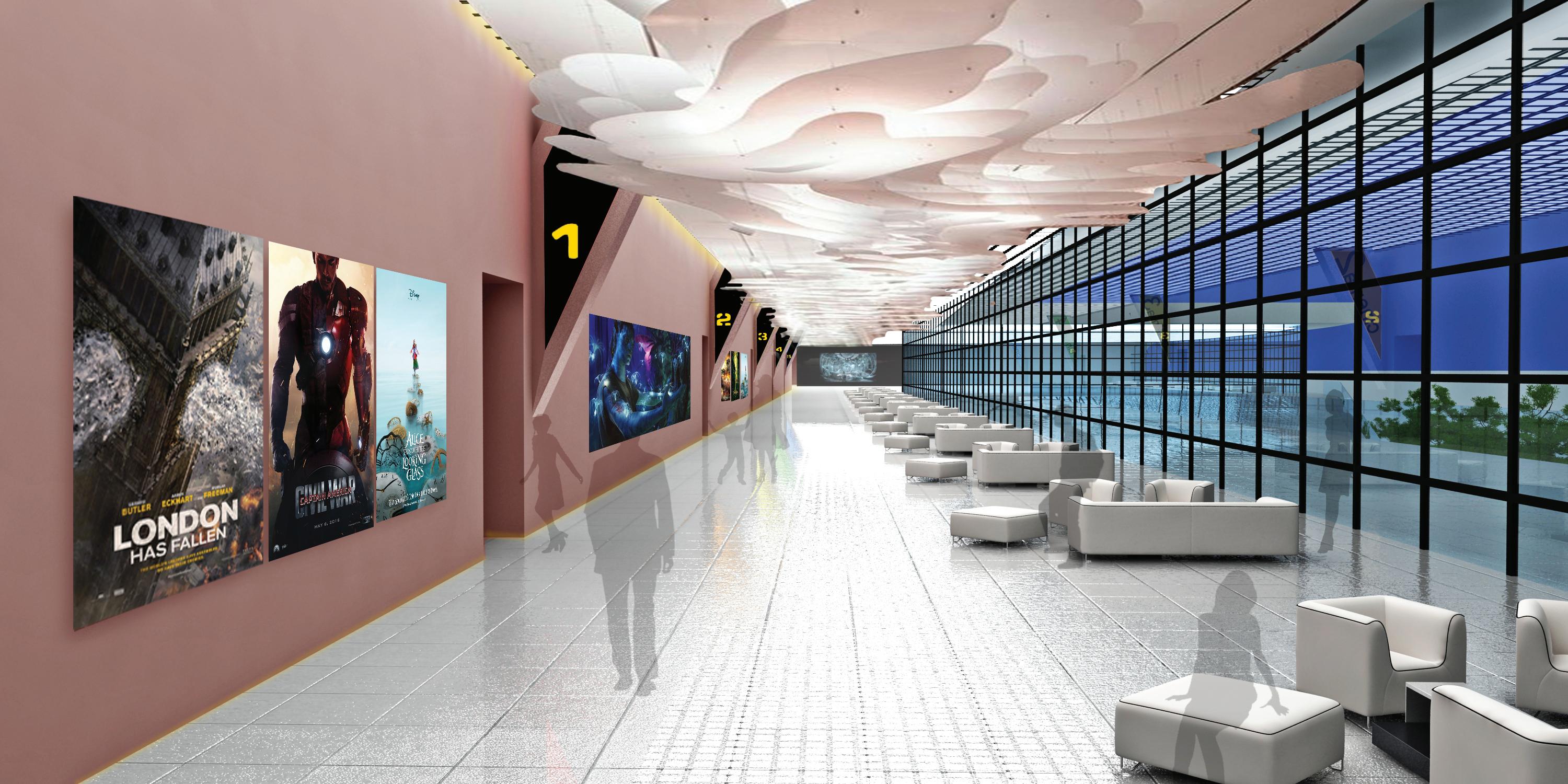 Alarge size high quality multiplex was required of us but within an existing mall, with a very unfortunate column spacing which provided for difficult and complex design. It did not help that we were not able to remove any existing structure, yet the client still wanted a set number of screens. Just to add extra design consideration this complex was to be a more cost effective multiplex than the last one within the Dubia mall, but yet to have similar feel.