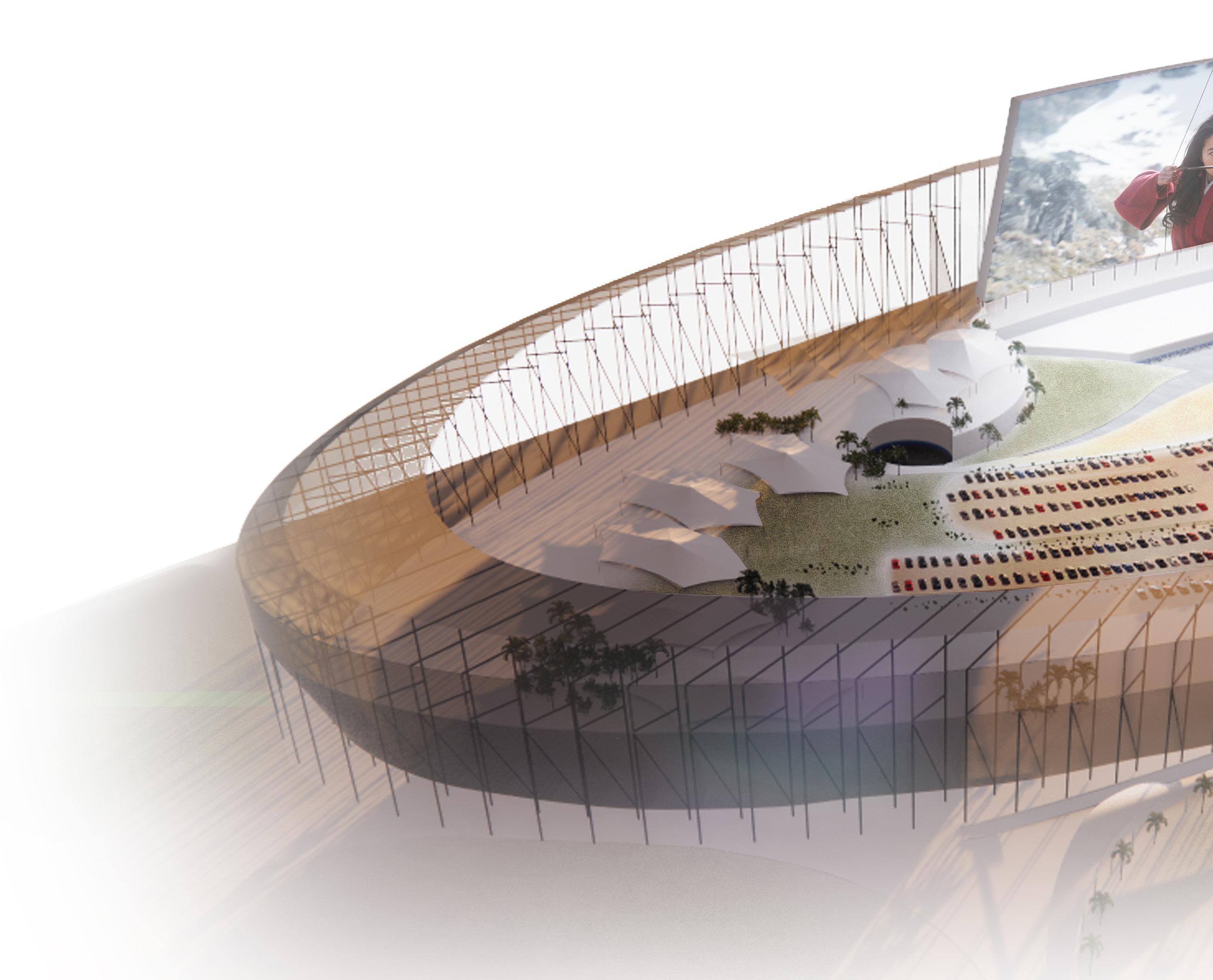 Brief given was quite simple, design a multipurpose entertainment venue that will house the largest movie screen in the world, a movie experience to eclipse all others. Our screen was 180 m wide by 66.6 m high using multiple Christies projector pods. Besides movie venue our design incorporated a variety of uses from rock concerts, product launches, gaming challenges, sports events, cultural and political events to name a few.
