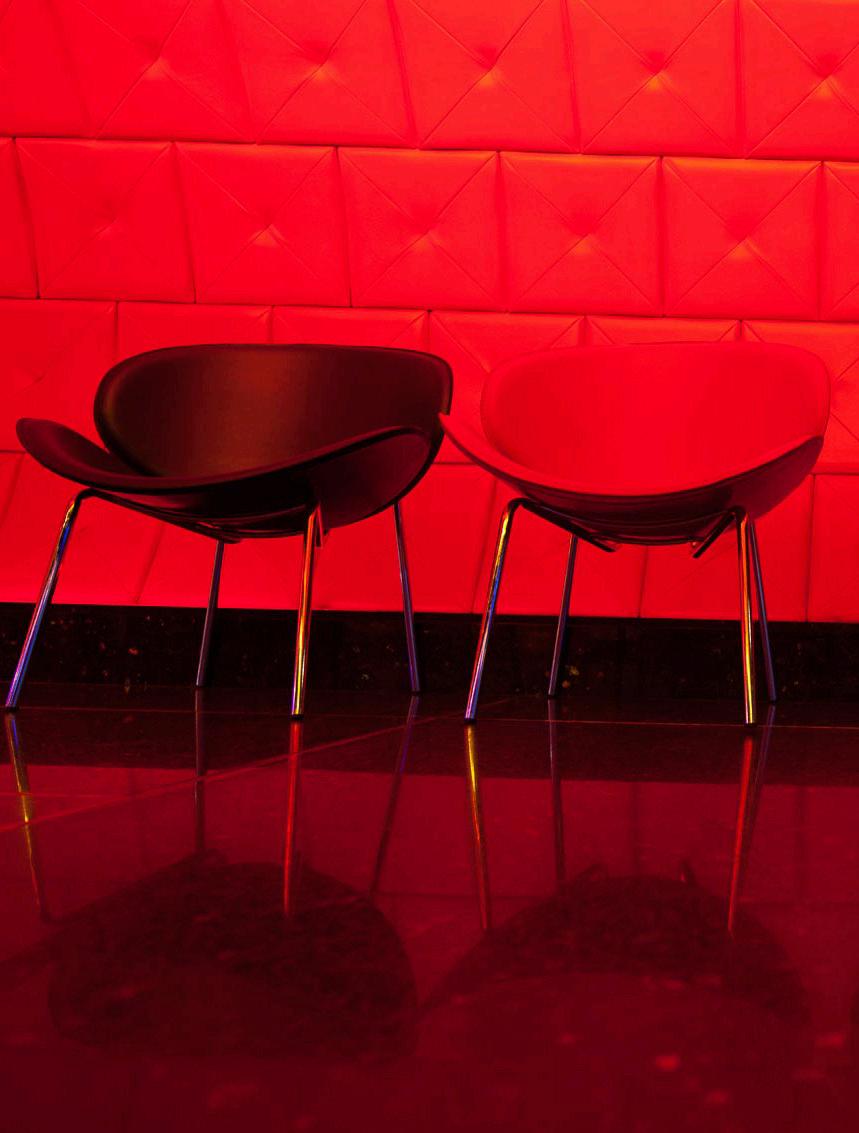 This six screen, 1100-seat complex occupies the first floor level of a multi-storey shopping centre in Bangalore, India. The concept is based around a rich colour scheme of red and blue offset against black and white ceiling and floor backgrounds. Materials were selected to define shape, changing under coloured light. Reflective and repeated shape surfaces multiply images of colour and texture. With very low ceiling heights and unworkable volumes in the shell building, this use of light and colour change give a sense of expanding space and richness of detail to the main ticket and concessions areas.