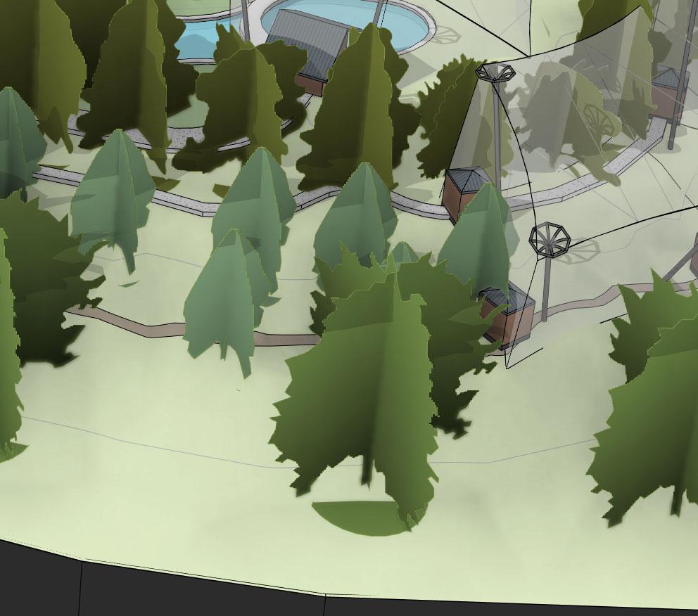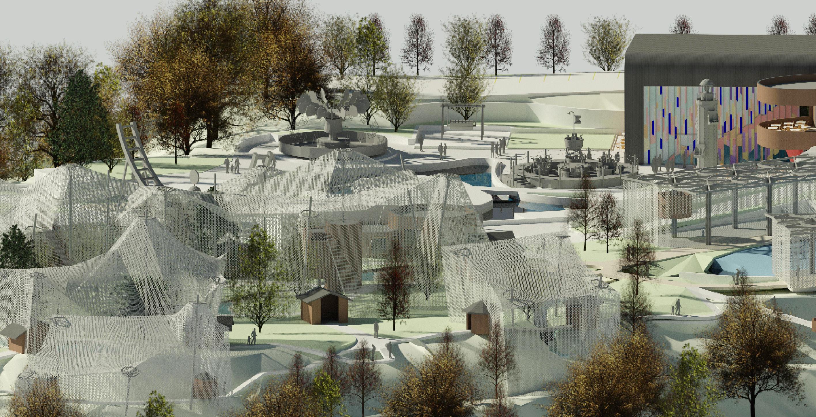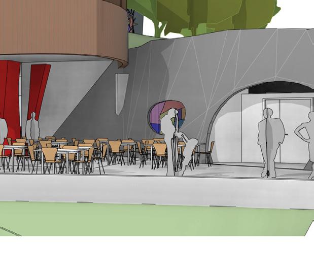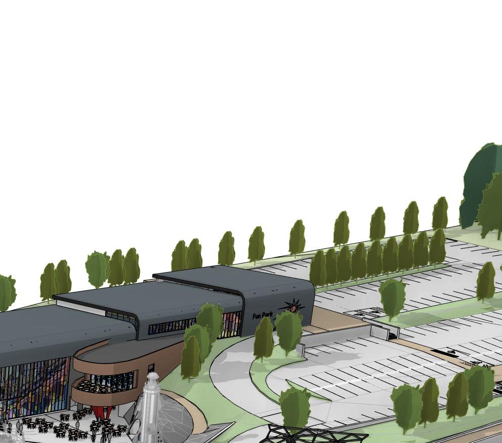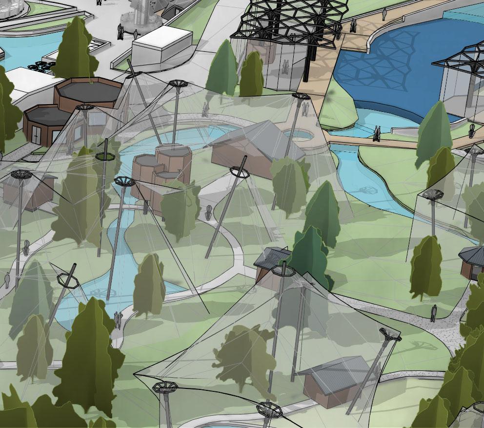 The main car park linked to a new Aviary complex which will be New Zealand’s biggest, this also has sections for fully immersive experience with birds. The scheme has lakes and dramatic hillside tree houses for the public within the huge aviary. A small scale railway traverses both sites with attractions on the way, full size dinosaurs which move, and a range of educational elements. Both facilities have cafes, flexible areas for events and have been scaled for peak school holiday crowds.