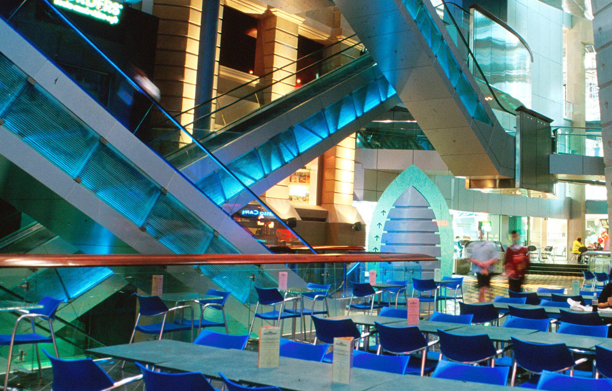 Blurring the lines between entertainment and retail mall, the 8 screen multiplex is on the 3rd floor to one side of a spectacular atrium formed under a dome. On the same floor as the multiplex is typically a cafe court and restaurant bars which step down into a landscaped oasis.