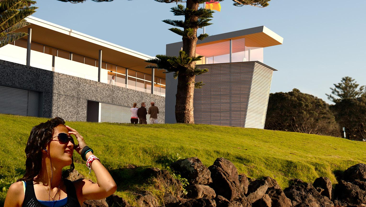 The new Clubhouse orientates across the park towards the ocean edge. Its bulk is raised above the park to enhance the views through and across the park towards the ocean and to provide a covered entrance. The entry provides separate access to the ground level club rooms and changing/ toilet facilities from upstairs functions and dining facilities. The entry doubles as welcome reception and kiosk community retail. New exterior seating areas and decks have been designed around the club house for the benefit of the Clubhouse users and general visitors to the area. The ground forms create a solid base for the new building and conceal a semi-basement storage area for boats and ocean equipment accessed from the beach ramp below.
