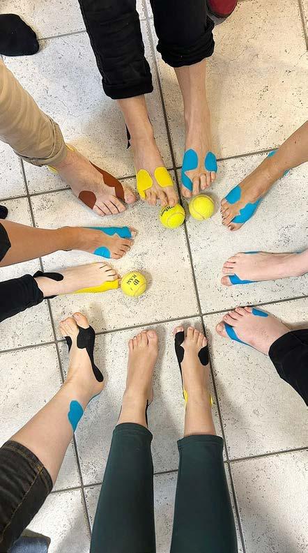 Darüber hinaus erhielten die Teilnehmer:innen eine Einführung in unterschiedliche Tapingtechniken für podologisch relevante Indikationen. Dazu gehörten unter anderem Tapings zur Entlastung, Stabilisation sowie zur Unterstützung des Gangbildes. Constance Beurret erläuterte die Anwendungsschritte, die Klebetechnik sowie praktische Hinweise zur Haltbarkeit und Wirkungsweise.