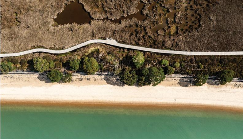 Below left: The boardwalk at Āwhitu Regional Park offers views of the wetlands and white sand beaches of Kauritūtahi Beach.