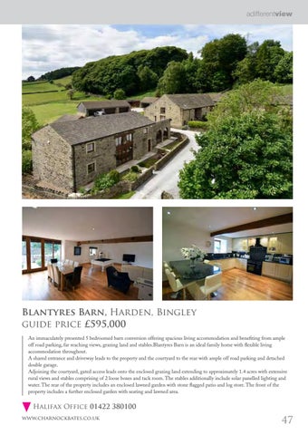 Blantyres Barn, Harden, Bingley guide price ÂŁ595,000 An immaculately presented 5 bedroomed barn conversion offering spacious living accommodation and benefiting from ample off road parking, far reaching views, grazing land and stables.Blantyres Barn is an ideal family home with flexible living accommodation throughout. A shared entrance and driveway leads to the property and the courtyard to the rear with ample off road parking and detached double garage. Adjoining the courtyard, gated access leads onto the enclosed grazing land extending to approximately 1.4 acres with extensive rural views and stables comprising of 2 loose boxes and tack room. The stables additionally include solar panelled lighting and water. The rear of the property includes an enclosed lawned garden with stone flagged patio and log store. The front of the property includes a further enclosed garden with seating and lawned area.