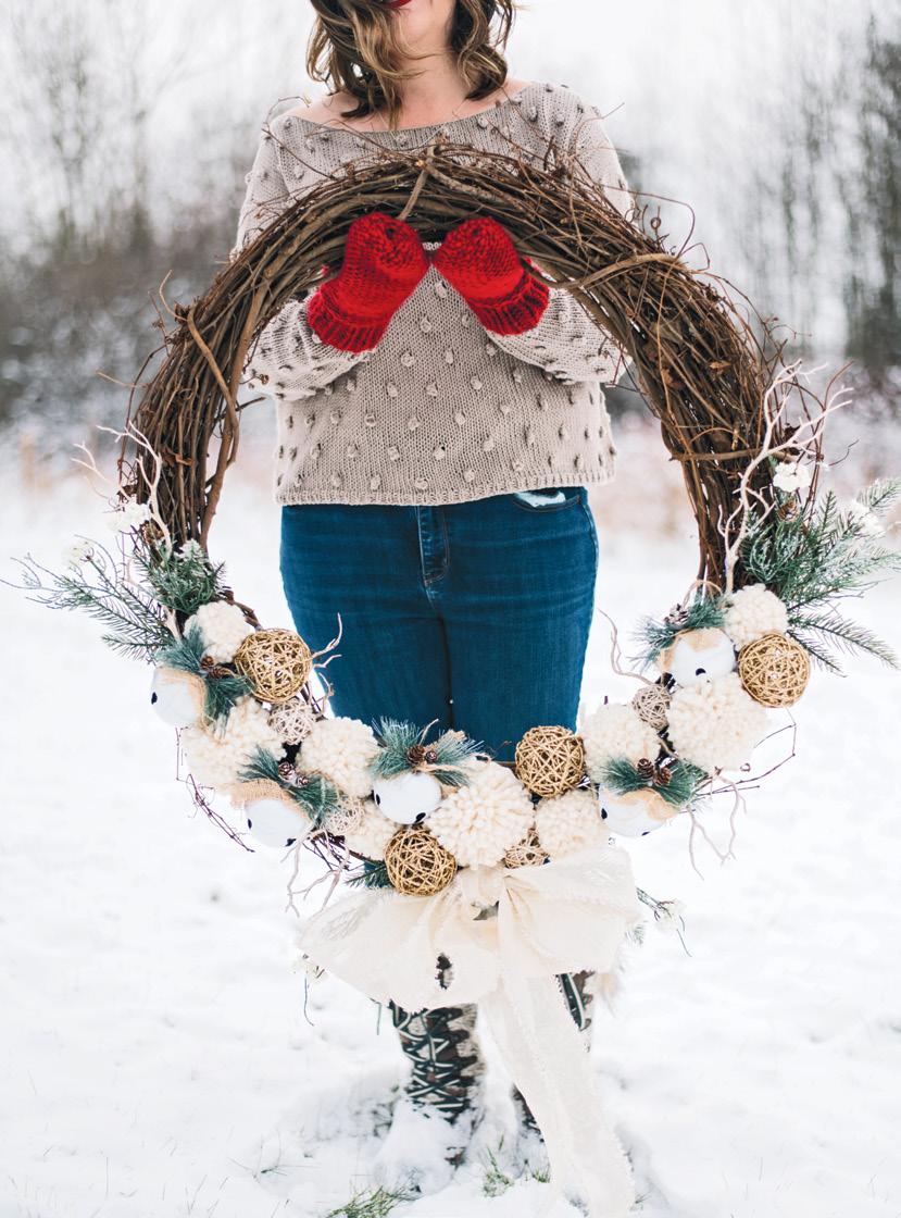 Create a beautiful, rustic wreath for your front door this Holiday season by starting with a large grapevine wreath base. Using a hot glue gun, attach pom-poms, faux greenery and bells of various sizes to the bottom half of the wreath. Finish the wreath by attach a large bow to the bottom and enjoy your handiwork!