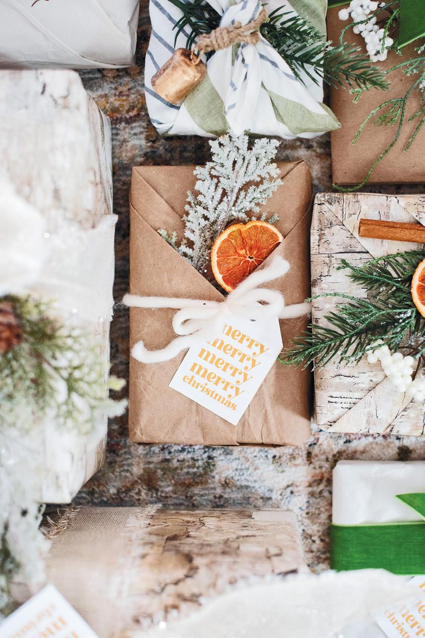 You can easily find recycled paper at your local dollar store, or you can get even more creative and use old maps, magazines, or even newspapers to wrap your gifts. Saving brown packing paper from your mail and using it to wrap gifts can look beautiful if you add a topper like dried oranges or sprigs of greenery.