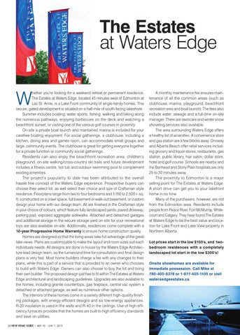 hether you’re looking for a weekend retreat or permanent residence, The Estates at Waters Edge, located 45 minutes west of Edmonton at Lac St. Anne, is a Lake Front community of single-family homes. This secure, gated development is situated on a half-mile of south-facing lakeshore. Summer includes boating, water sports, fishing, walking and biking along the numerous pathways, enjoying barbecues on the deck and watching a beachfront sunset, or visiting one of the various golf courses in proximity. On-site a private boat launch and maintained marina is included for your carefree boating enjoyment. For social gatherings, a clubhouse, including a kitchen, dining area and games room, can accommodate small groups and large, community events. The clubhouse is great for getting everyone together for a private function or community social gatherings. Residents can also enjoy the beachfront recreation area, children’s playground, on-site walking/cross-country ski trails and future development includes a fitness centre, hot tub and outdoor swimming pool to complement existing amenities. The project’s popularity to date has been attributed to the overall hassle free concept of the Waters Edge experience. Prospective buyers can choose their select lot; as well select their choice and size of Craftsman style residence. Floorplans range from two to four bedrooms and 1,150 to 2,500+ sq. ft. constructed on a crawl space, full basement or walk-out basement, or custom design your home with our design team. All are finished in the Craftsman style in your choice of colours, which feature fully landscaped yards, paved driveway, parking pad, exposed aggregate sidewalks. Attached and detached garages and additional storage in the secure storage yard on-site for your recreational toys are also available on-site. Additionally, residences come complete with a 10-year Progressive Home Warranty to ensure home construction quality. Homes are designed so that the living areas take full advantage of the great lake views. Plans are customizable to make the layout and room sizes suit each individuals needs. All designs are done in-house by the Waters Edge Architecture lead design team, so the turnaround time for consultation and final design plans is very fast. Most home builders charge a fee with any changes to their plans, while this is part of a service that is provided to an owner who chooses to build with Waters Edge. Owners can also choose to buy the lot and bring their own builder. The proposed design just has to fit within The Estates at Waters Edge architectural and landscaping guidelines. Upgrades are also available to the homes, including granite countertops, gas fireplace, central vac system a detached or attached garage, as well as numerous other options. The interiors of these homes come in a variety different high-quality finishing packages, with energy-efficient designs and six low-energy appliances. R-20 insulation is used in the walls and R-40 in the ceilings. Use of high efficiency furnaces provides that the homes are built to high efficiency standards and save on utilities. 28 New home Guide | may 10 - jun 7, 2013