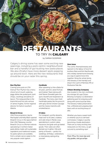 Zero Issue The comic-themed brewery and taproom is the labour of love for brothers Mark and Kirk MacDonald, who initially started home brewing as a way to spend more time together. Bring the whole family (the brewery is kid-friendly) and drop in for a pint of Nemesis IPA or Multiverse Pale Ale. Citizen Brewing Company Also located in the city’s northeast, the intimate 50-seat Citizen Brewing Company is a destination gathering spot for enjoying a pint along with some local bar bites. The brewery makes preservativefree, unfiltered and unpasteurized beers with an exciting lineup of ales. Whether you have a sweet tooth or whether you’re a craft beer connoisseur, Calgary is quickly becoming a foodie destination. There are so many exciting new restaurants on the menu, so get out and try something new!