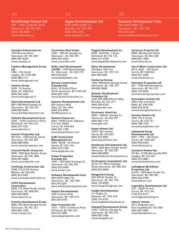Concert Properties Ltd. 9th Floor, 1190 Hornby Street Vancouver, BC V6Z 2K5 (604) 688-9460 www.concertproperties.com Concord Pacific Group Inc. #900, 1095 West Pender Street Vancouver, BC V6E 2M6 (604) 681-8882 www.concordpacific.com ConVerge Construction Ltd. #108, 31413 Gill Avenue Mission, BC V4S 0C4 (604) 814-3401 www.convergeconstruction.ca COPA Development Corporation #209, 515 West Pender Street Vancouver, BC V6B 6H5 (604) 683-0850 www.copacorp.ca Cressey Development Group #800, 925 West Georgia Street Vancouver, BC V6C 3L2 (604) 683-1256 www.cressey.com