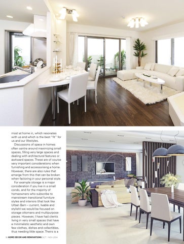 most at home in, which resonates with us and which is the best “fit” for us and our lifestyles. Discussions of space in homes often centre around maximizing small spaces, filling very large spaces and dealing with architectural features or awkward spaces. These are of course very important considerations when furnishing and accessorising a home. However, there are also rules that emerge from this that can be broken when factoring in your personal style. For example storage is a major consideration if you live in a small condo, and for the majority of homeowners who subscribe to mainstream transitional furniture styles and interiors (that look like Urban Barn – current, livable and stylish) we would be focused on storage ottomans and multipurpose pieces. However, I have had clients living in very small spaces that have a minimalistic aesthetic and own few clothes, dishes and collectibles, thus needing little space. Theirs is a 16 HOME DECOR AND RENOVATIONS OCT - NOV 2014
